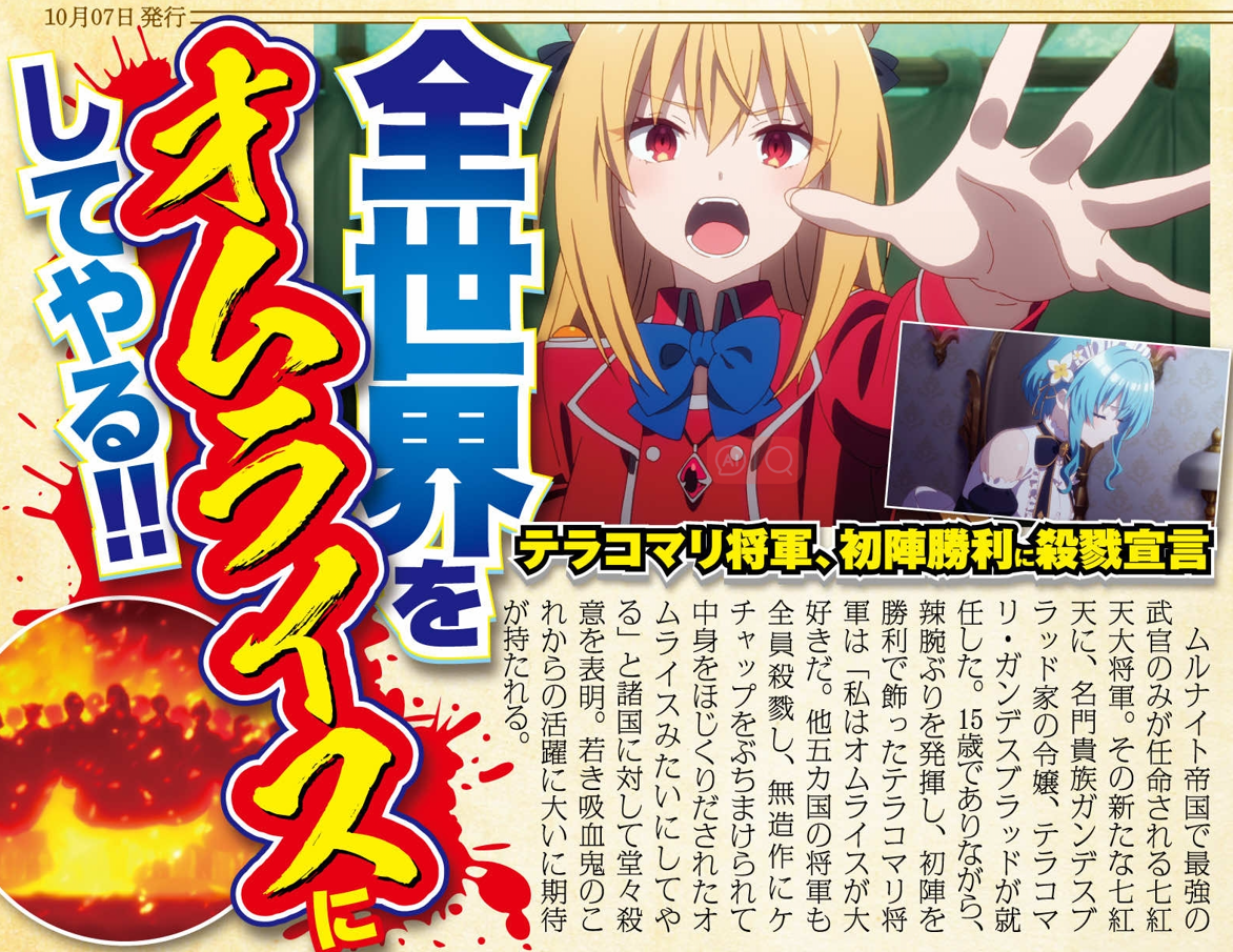 内容:在穆露奈依特帝国中,只有最强的武官才能被任命为七红天大将军。名门贵族加德斯布拉德的三女儿缇拉鞠·加德斯布拉德成为了新任七红天。尽管只有15岁,但缇拉鞠将军展现出了她的过人才能,在首战中取得了胜利。她表示:“我非常喜欢蛋包饭。我会像那些其他五个国家的将军一样击败他们,就像被随便泼上番茄酱挖出里面的蛋包饭一样。”这表明她对各国公开表达了自己坚定不移的杀意。人们对这名年轻吸血鬼的未来充满期待。