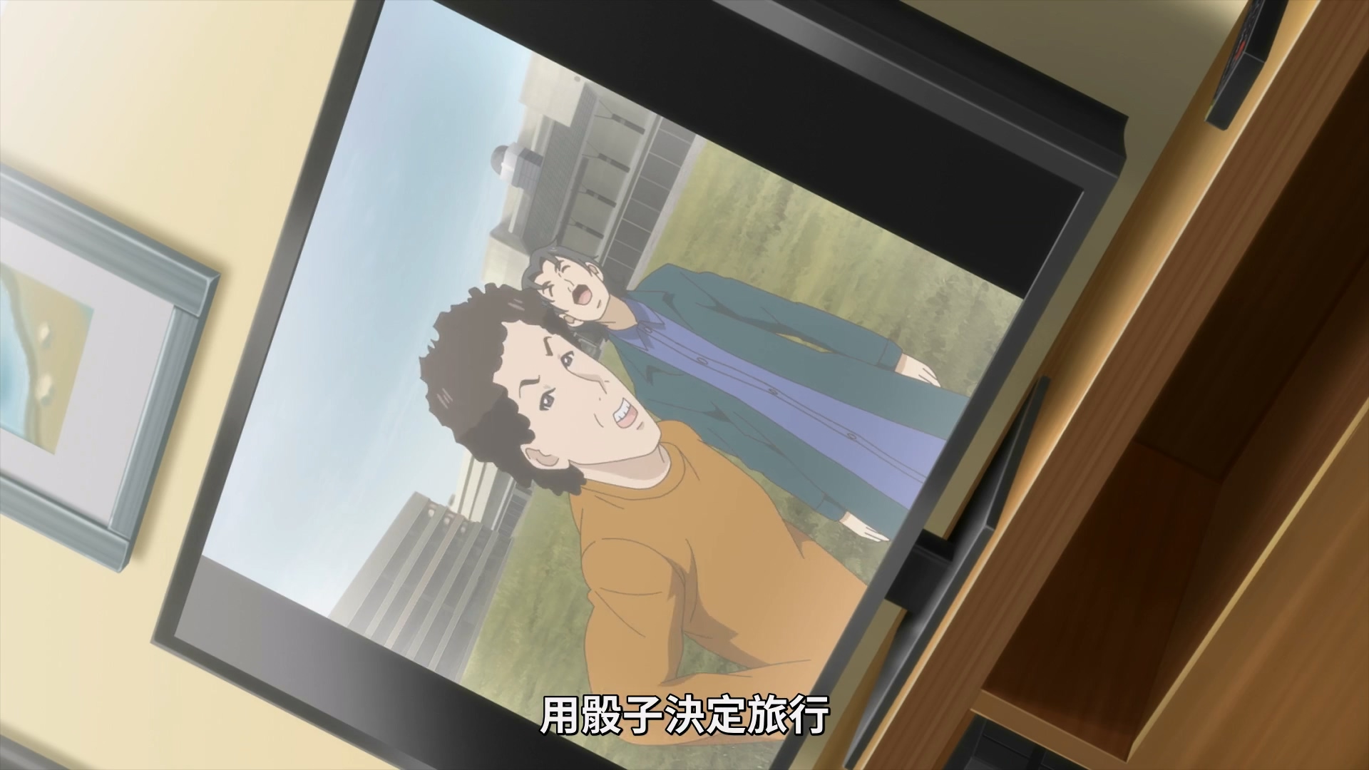 此时电视里播放的节目中说到用投骰子决定去哪里旅行,让千花一下找到目标,想去旅行