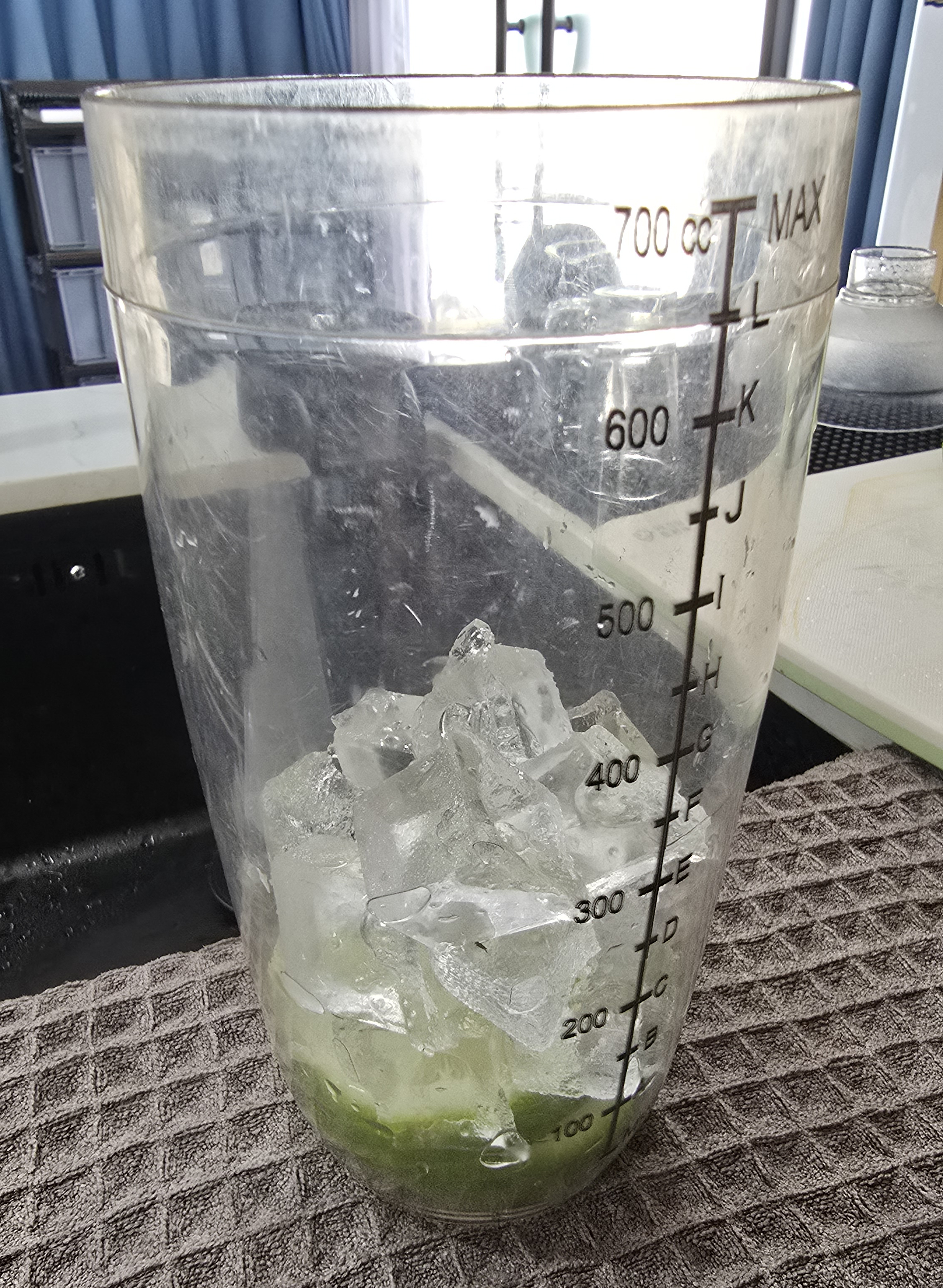 首先将香水柠檬洗干净之后切4片,放入十多粒冰块像锤柠檬茶一样锤碎