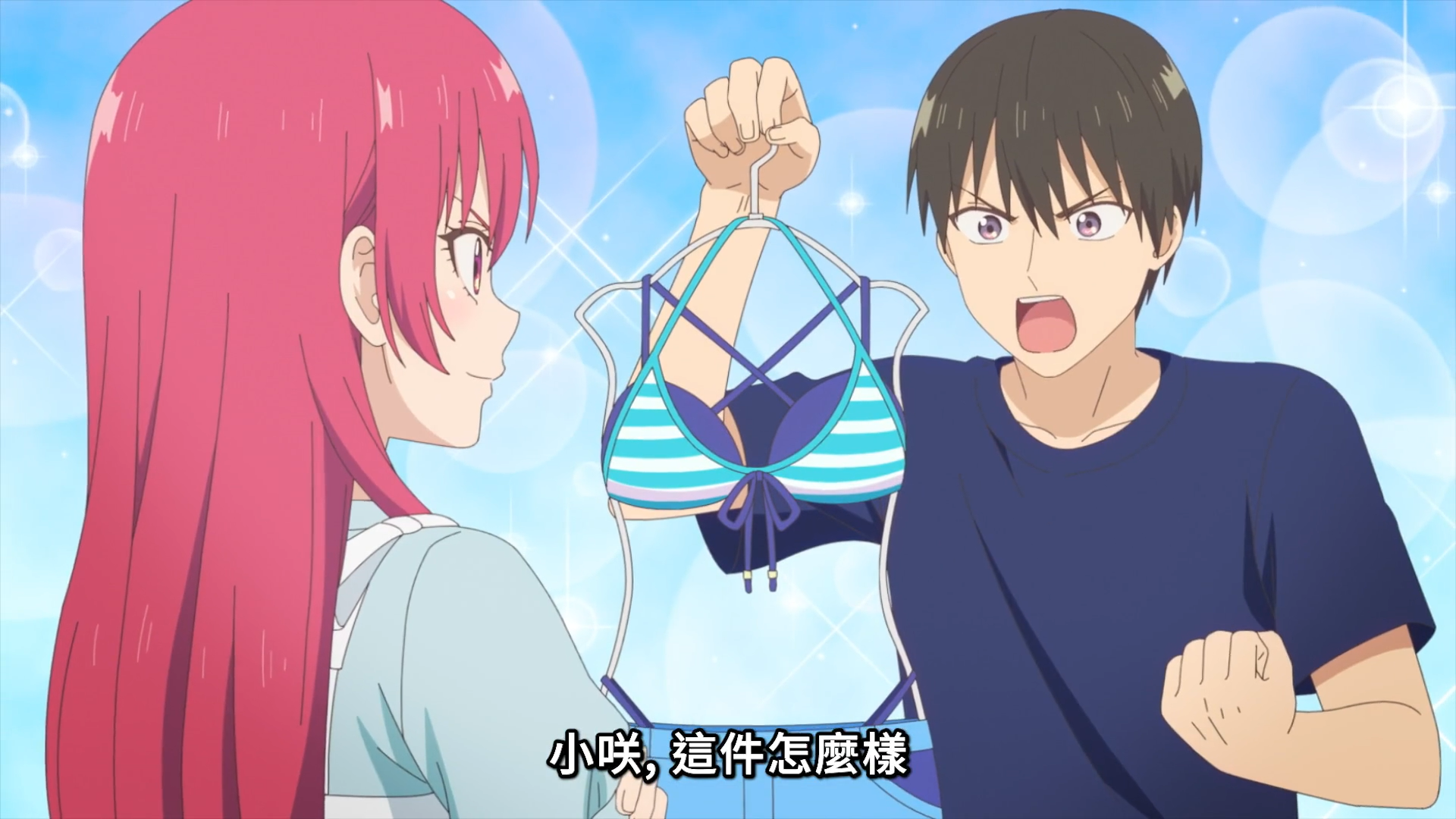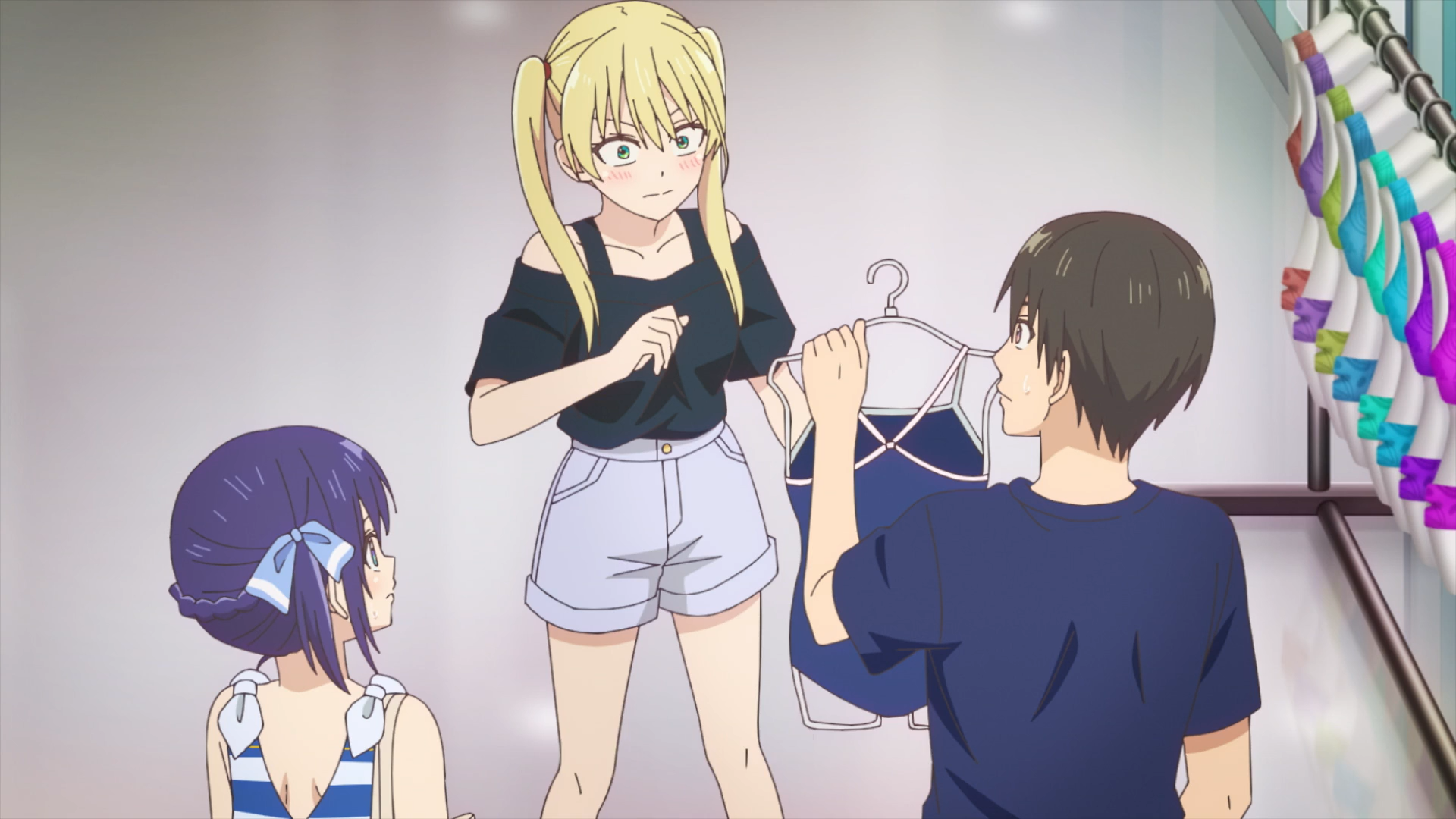 既然海滨旅行行程已经敲定,那么下一个环节就是ACGN恋爱喜剧里的常见桥段——挑选泳装了。直也率先给咲挑了一件符合她运动型身材又有点H的泳装