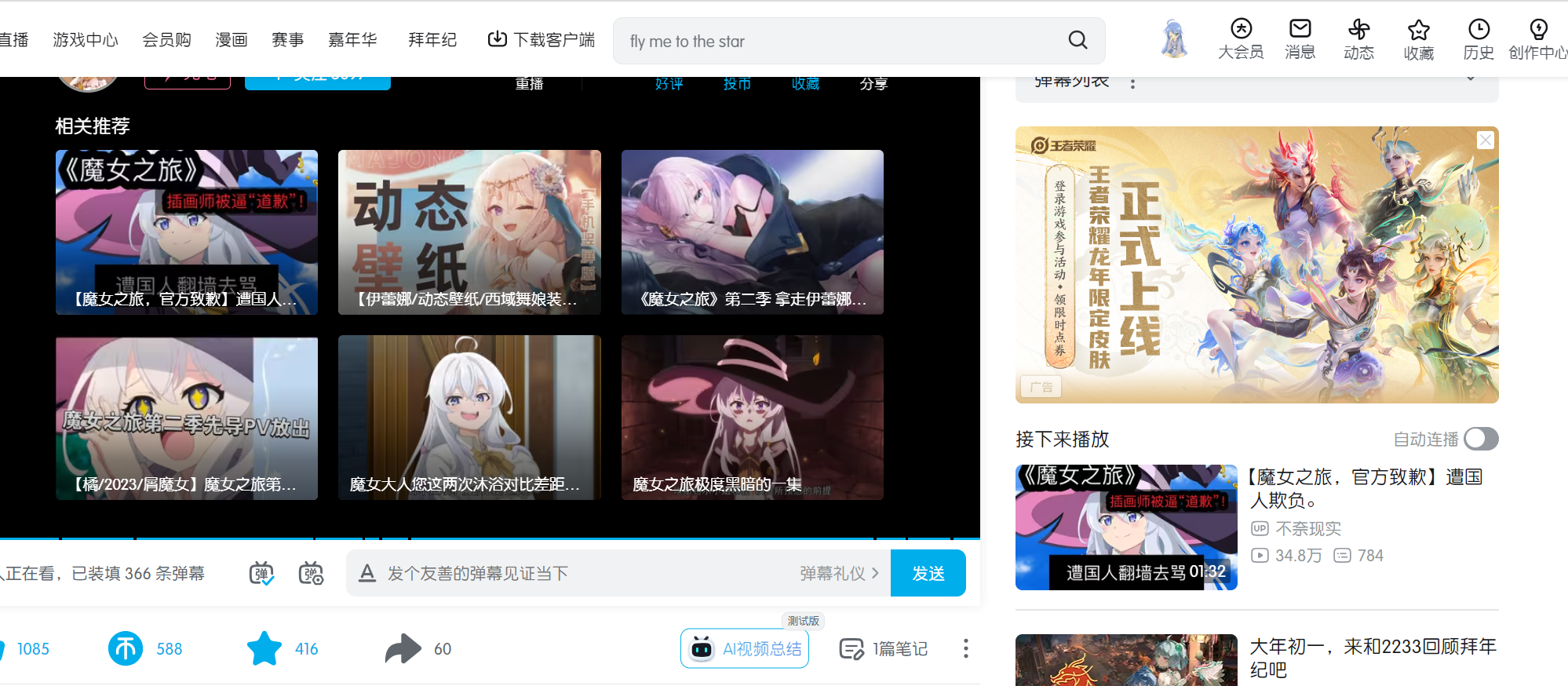 周董這首歌挺適合放在這裡的,感覺自己隨著華麗的音樂和歌詞,和魔女一同穿越在回憶和番劇交織成的金粉之中,炫亮的光彩、璀燦的繁星,融入在角色帶來的悸動還來不及抽離,又隨著心跳的振幅跨越時空,直到楓紅飄零風吹走了魔女帽,淚水滴落手背,才又帶著我們進入另一度時空,真是精彩的剪輯啊,填詞配合可愛的舞蹈,優雅的古詞配合日文旁白,令人驚艷,鏡中遊記代入感很深,大家的聲線都好棒, " 終無悔走一趟"那一段會很想跟著唱233,中間彈奏的小星星,讓我想起以前好友的鋼琴發表會,也曾彈過一首小星星變奏曲,KING那裡聽過一次,第二次用不同的倍速聽更來勁,後半的故事線引人入勝,整體而言魔女之旅贺年纪豐富美好,層次多變,可以感受到製作團隊及魔女大大們的用心