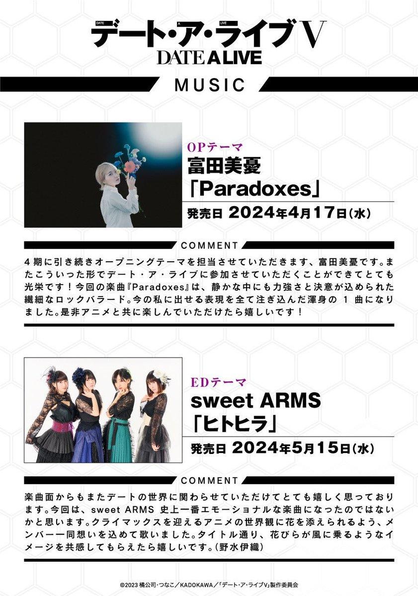 由 橘公司 所創作、つなこ 擔任插畫、並預計自 2024 年開始播映的電視動畫《約會大作戰 DATE A LIVE 第五季》。官方就在 15 日這天正式告知動畫將自 2024 年 4 月起開始播映,並釋出主視覺圖、首波宣傳影片、主題曲和本作的 Blu-ray&DVD BOX 的相關情報。