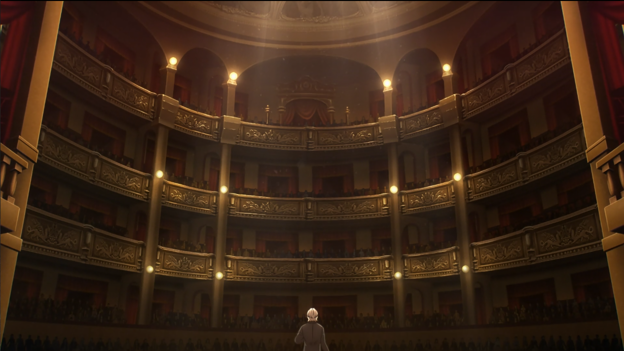正篇一开场就在一家音乐厅里,此时音乐厅的中央正被观众瞩目,音乐厅里音乐与歌唱齐鸣。