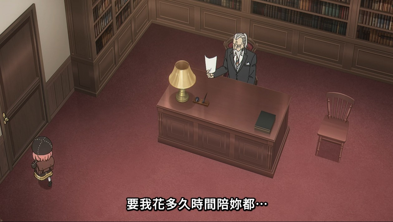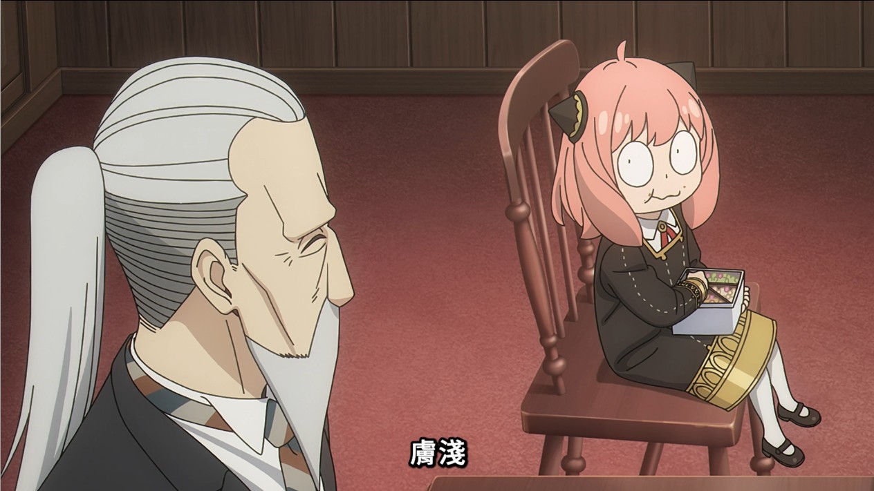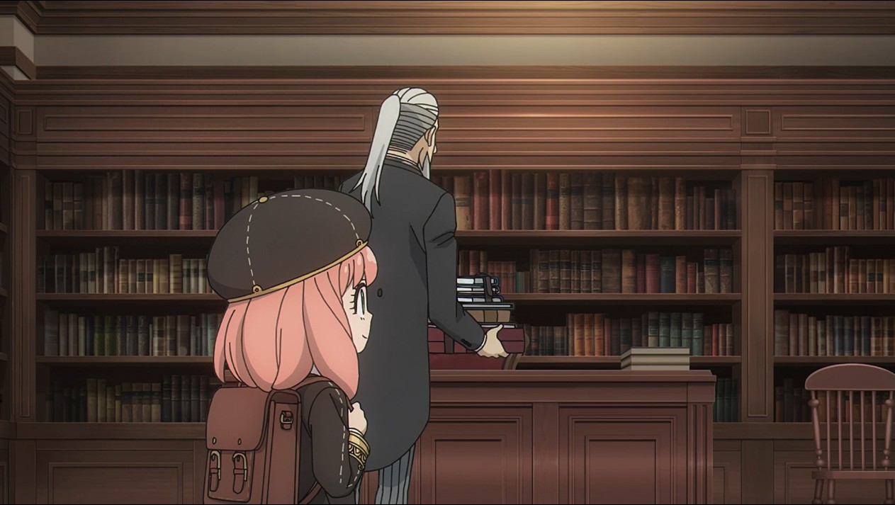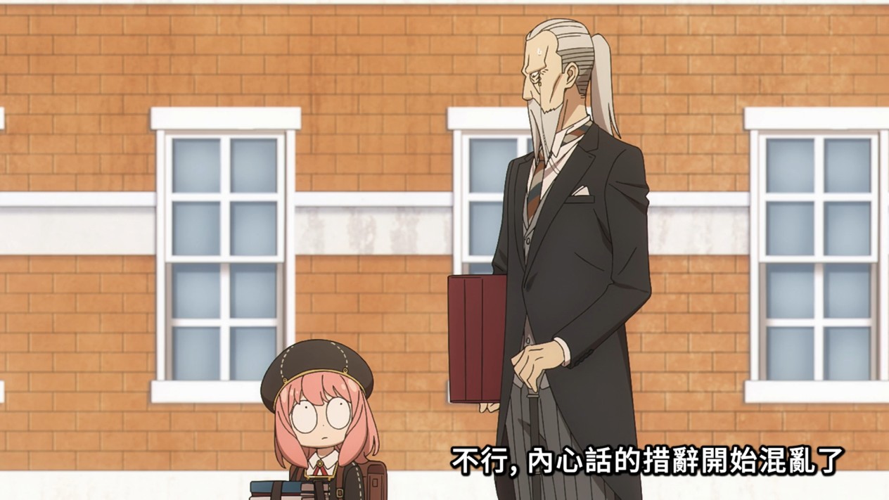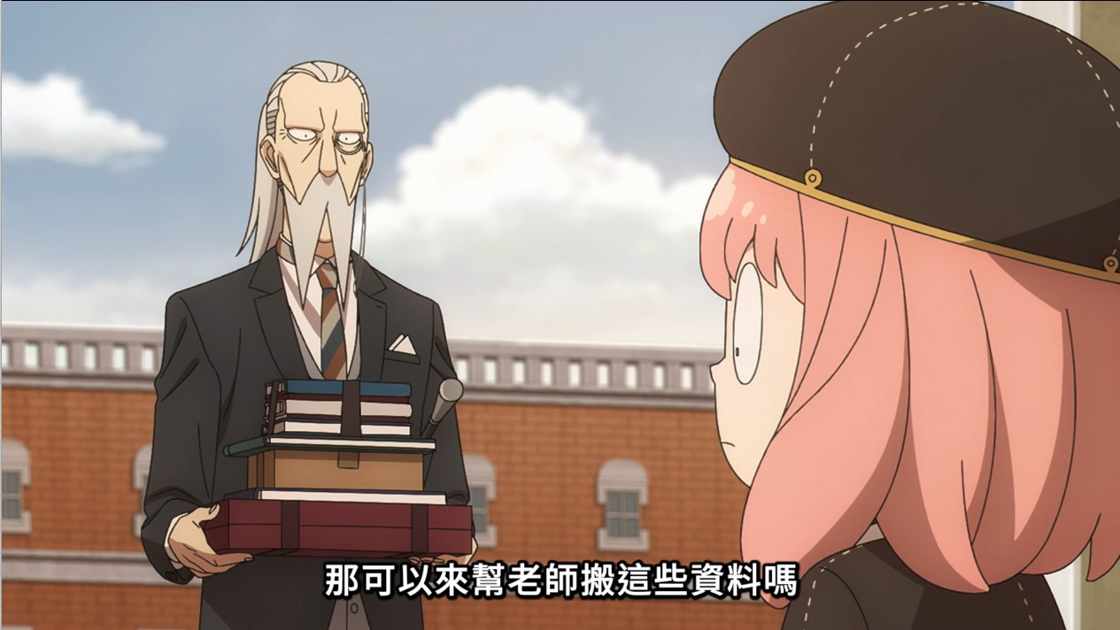 阿尼亚表示自己现在正忙着享受无聊(学会了,下次就这样说()),优雅大师表示不要这么不情愿嘛,要是帮忙的话就请阿尼亚吃茶点(愿者上钩.jpg)。想都不用想,阿尼亚上钩了,她立刻跳下椅子跟了上去。两人并排而行,阿尼亚帮优雅大师拿了一部分的书,一边走着优雅大师一边问阿尼亚还喜欢学校生活吗(这算是开小灶吧()看得出来多少有点照顾阿尼亚了),阿尼亚则直白的回了个“普通”,然后似乎想到了什么,有点流汗的阿尼亚赶紧问优雅大师不喜欢学校是会被退学还是会变成烂苹果,优雅大师马上否认说没这回事。优雅大师接过话茬,说他在学生时代也是没什么朋友的(没什么不代表没有哦,一个小小的伏笔),而且天天抱怨(说实话看不太出来())。听到这些的阿尼亚反过来安慰优雅大师“老师不要放在心上,好可怜哦”。(不是,你)
