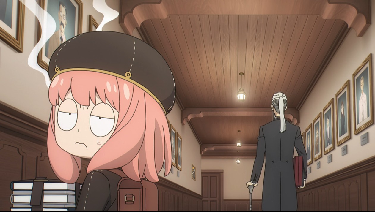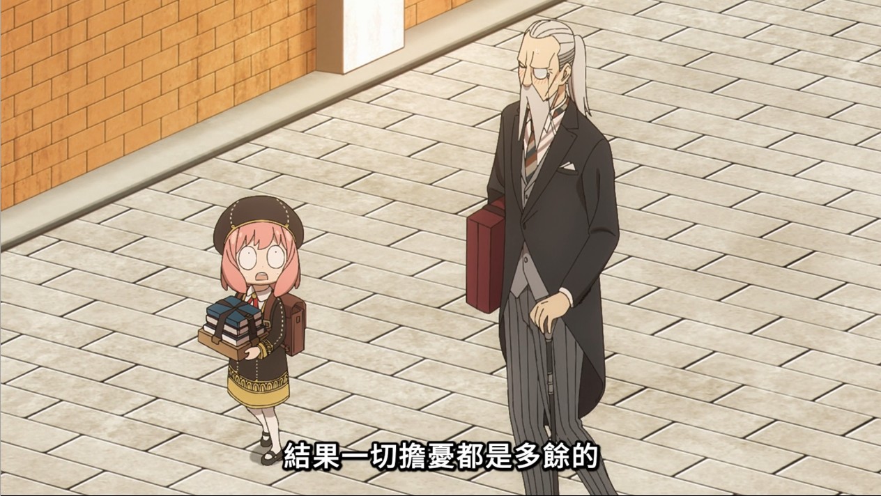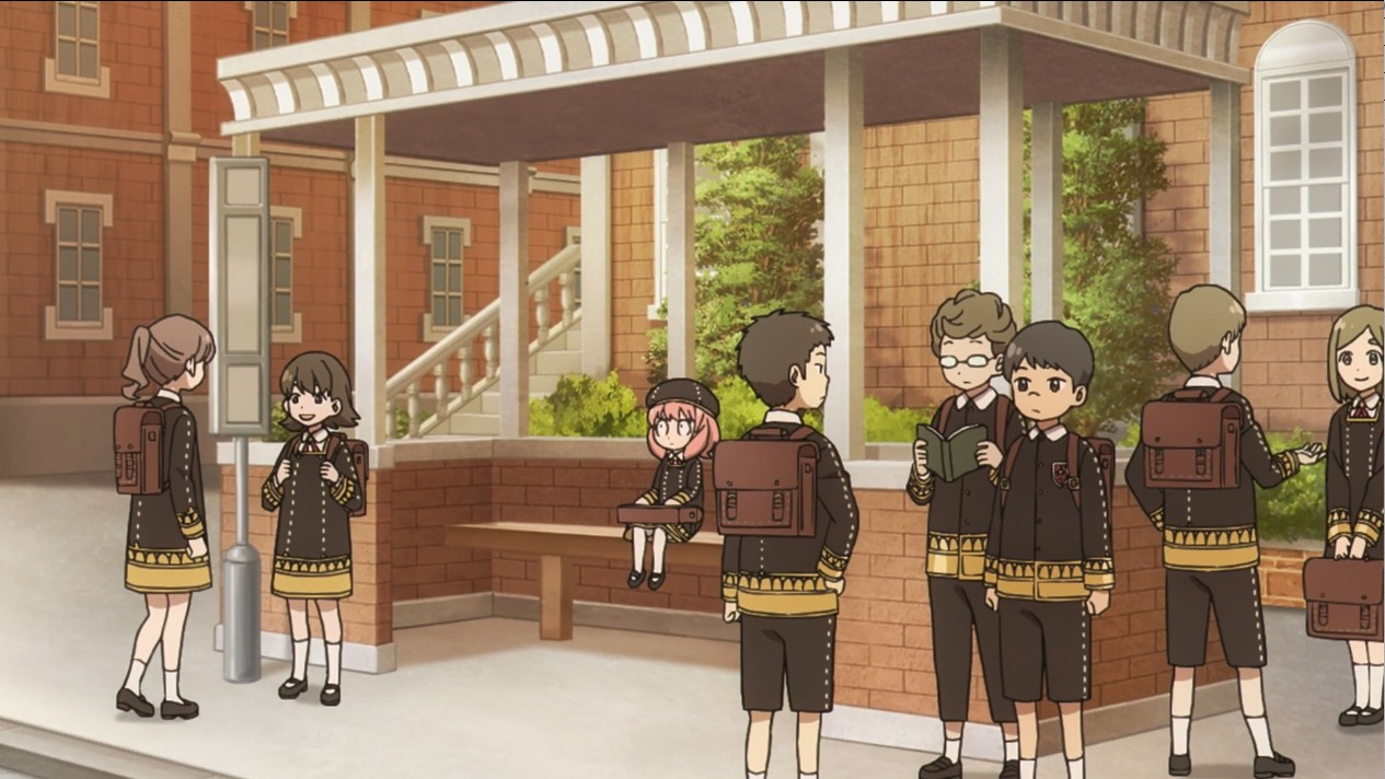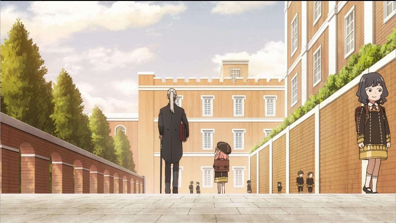 上一个故事告一段落,新一个故事接踵而至。画面从有些冷调的地下办公室切换到黄昏下的学院。看样子是放学了,阿尼亚跟贝姬告别后孤零零的等着巴士。
