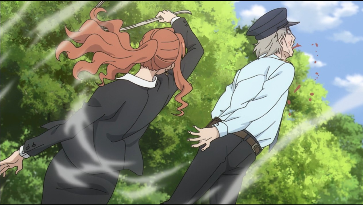 一边拧消音器,一边看着有点魔怔的说着制裁这个词语,感到事情不妙的盯梢不由得暗叫糟糕。歌唱家从后门走了出来,拧好消音器的刺客已经做好准备,打算找准时机动手了。正在这时,管理员他们驱车到达了现场,跟随的间谍马上通过对讲机了解情况,盯梢马上通报了当前情况,管理员马上下令要求盯梢拦住歌唱家,他们马上前去阻止刺杀。在盯梢成功挡住歌唱家的时候,管理员一个箭步冲向刺客,她抽出皮带,径直且狠狠地给了对方一击,下掉了对方的手枪(不是,其他俩在干啥,头儿自己去干人??),对方反应也算快,马上掏出小刀,但是管理员更快,直接一皮带把对方打晕了。(可是…可是他咳血了… — 打晕了,OK? — …打…打晕了)