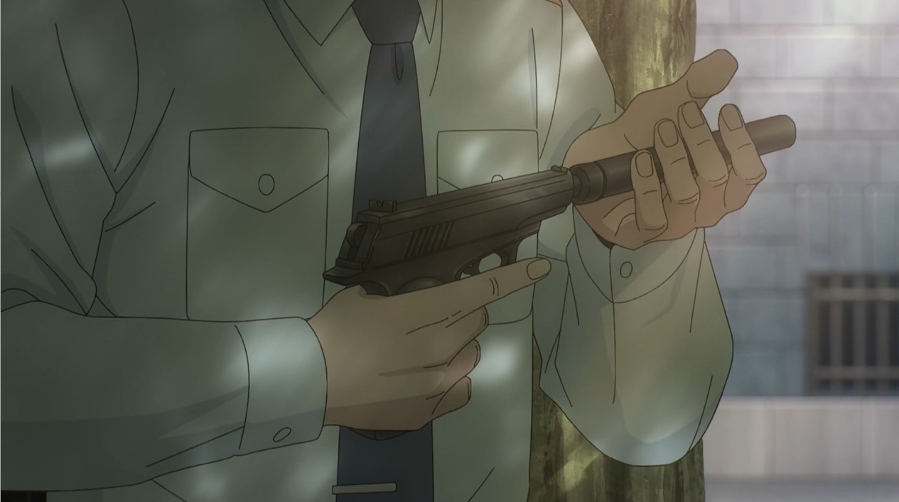 此时的他摸索了下,似乎掏出了什么东西。不过魔高一尺道高一丈,旁边假装看着报纸的间谍正密切关注着他。盯梢的人对“警卫”掏出的东西吃了一惊,此时镜头仿佛在回答观众的疑问一般,以特写镜头回答了这个问题——一只正在拧消音器的手枪。(一成的含金量())