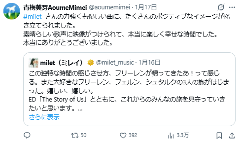 青梅美芽也对milet的演唱给予了高度评价,她表示,这首兼具力量感与温柔感的歌曲,总能让人在脑海中浮现出满是正能量的画面。能够将动人的歌声与唯美的手绘画面相结合,整个创作过程既愉悦又充满幸福感,她也对这次合作机会表达了由衷的感谢。