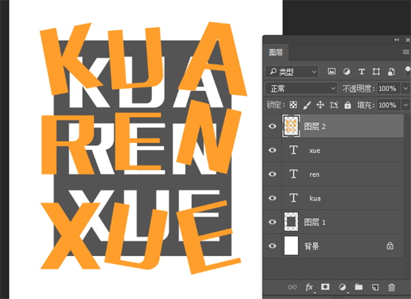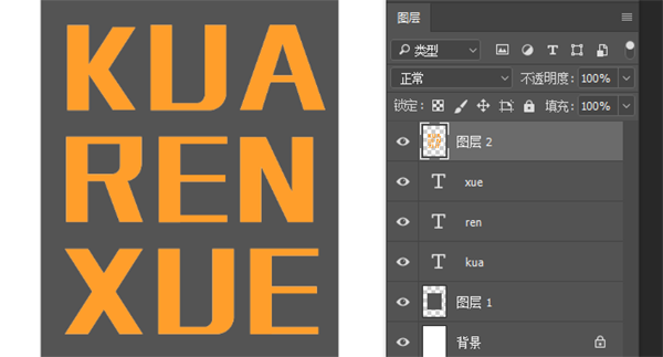 4、前景色改为橙色,按ctrl键点击文字图层缩略图,出现选区,按shift键加选。出现选区后,选中图层2,alt+delete填充,就会出现橙色文字