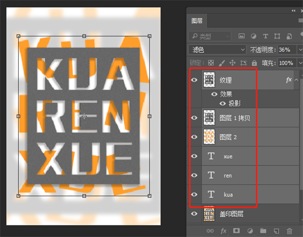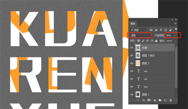 8、把纹理的图层混合模式改为滤色,不透明度36%