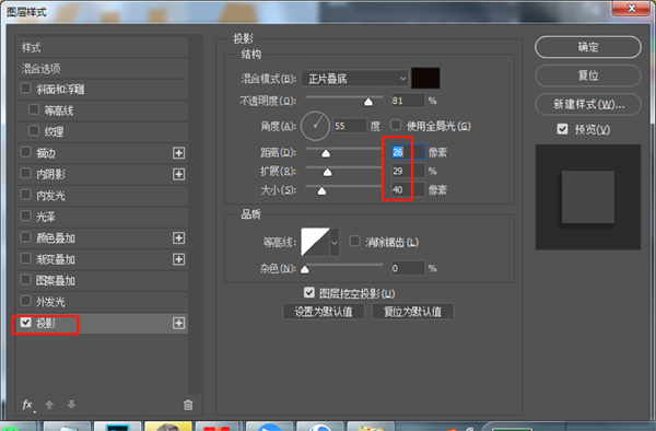 10、双击纹理图层,添加投影,数值如下: