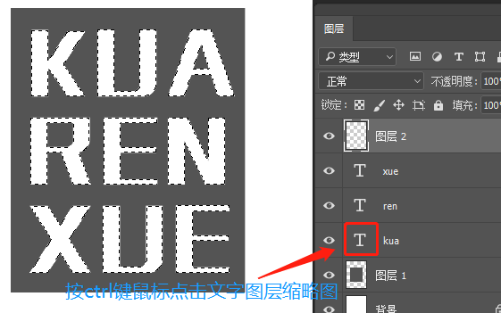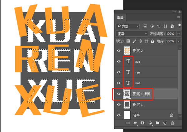 6、(ctrl+j)复制图层1,按ctrl键点击文字图层缩略图,出现选区后,选中图层1拷贝按delete键删除,ctrl+d取消选区。