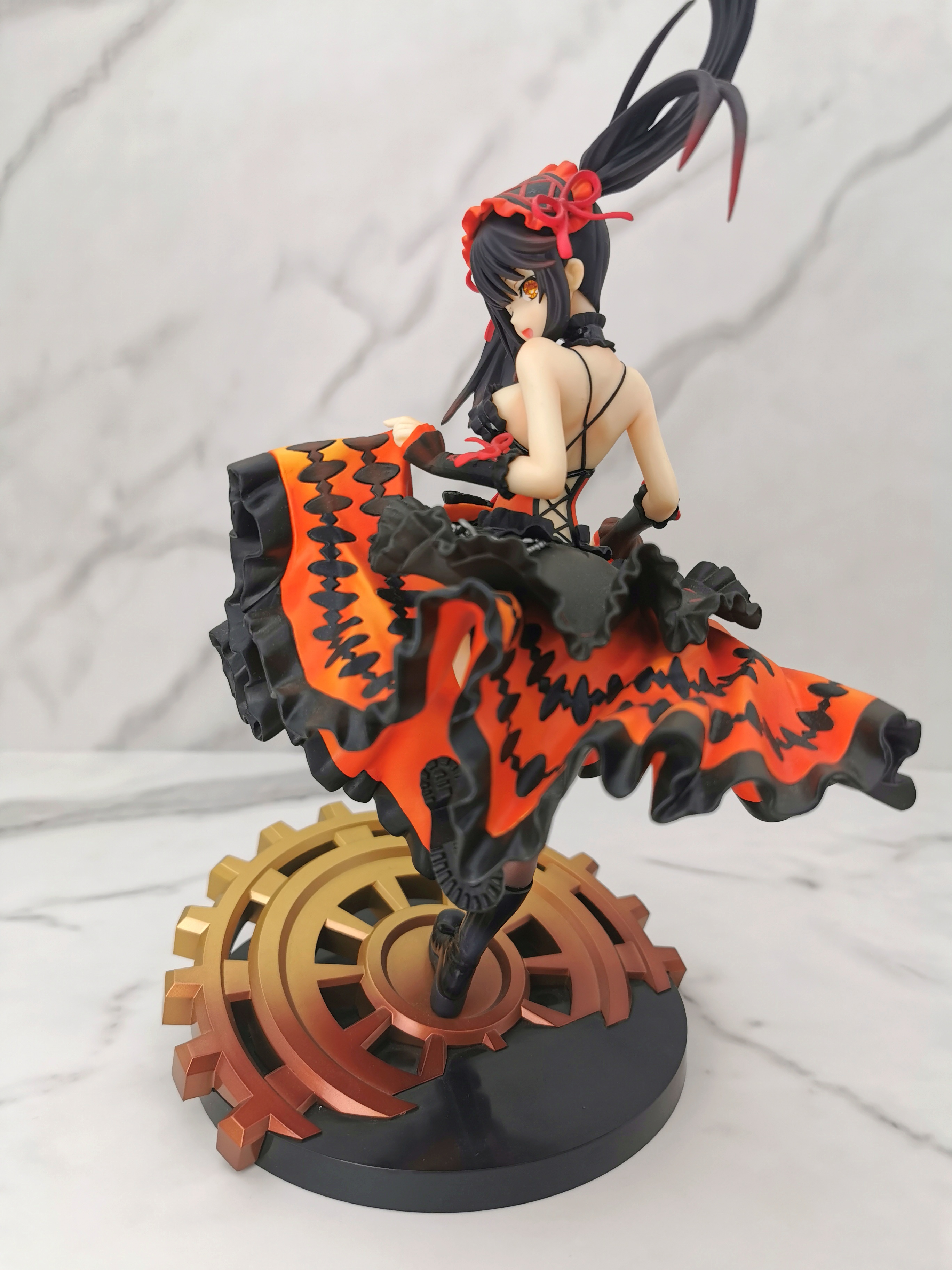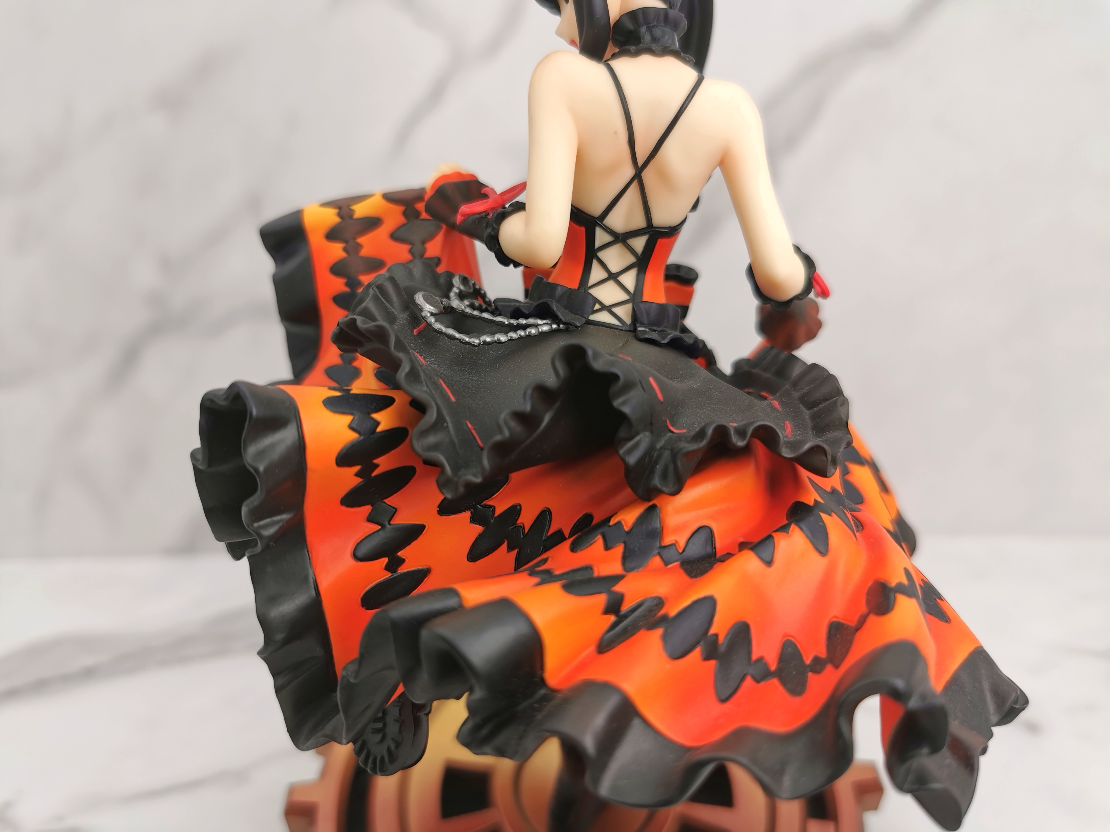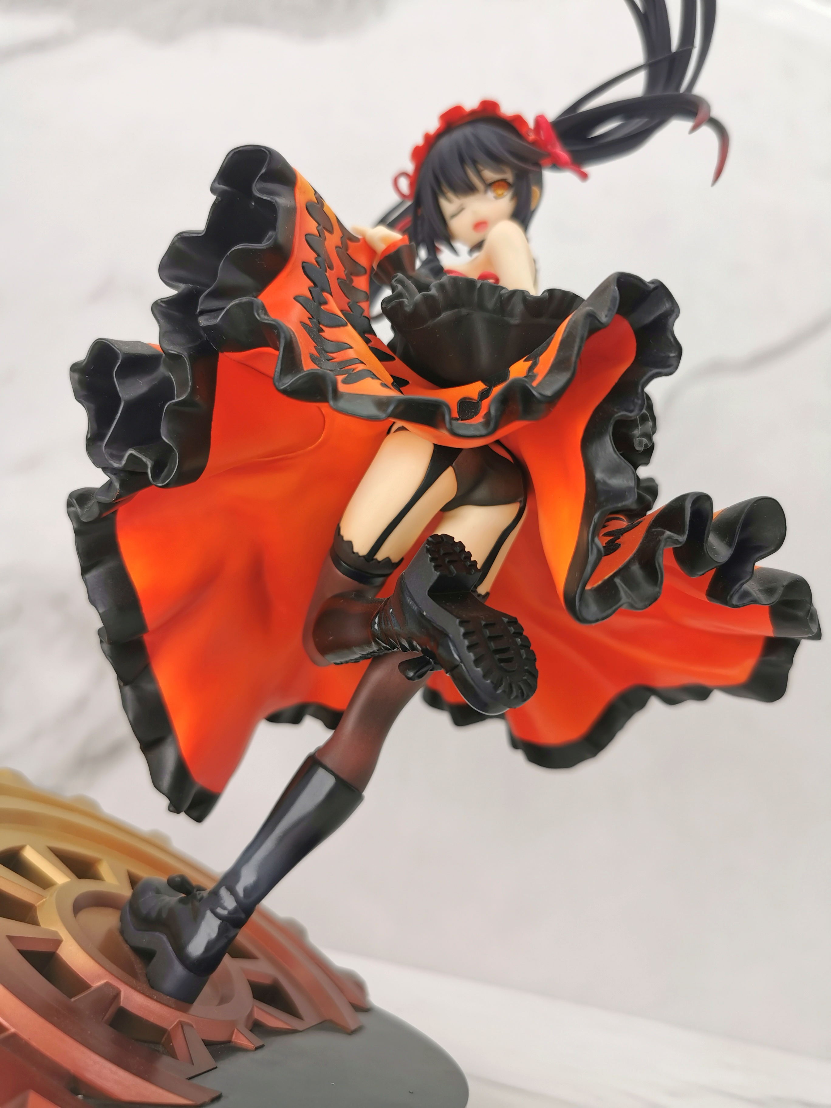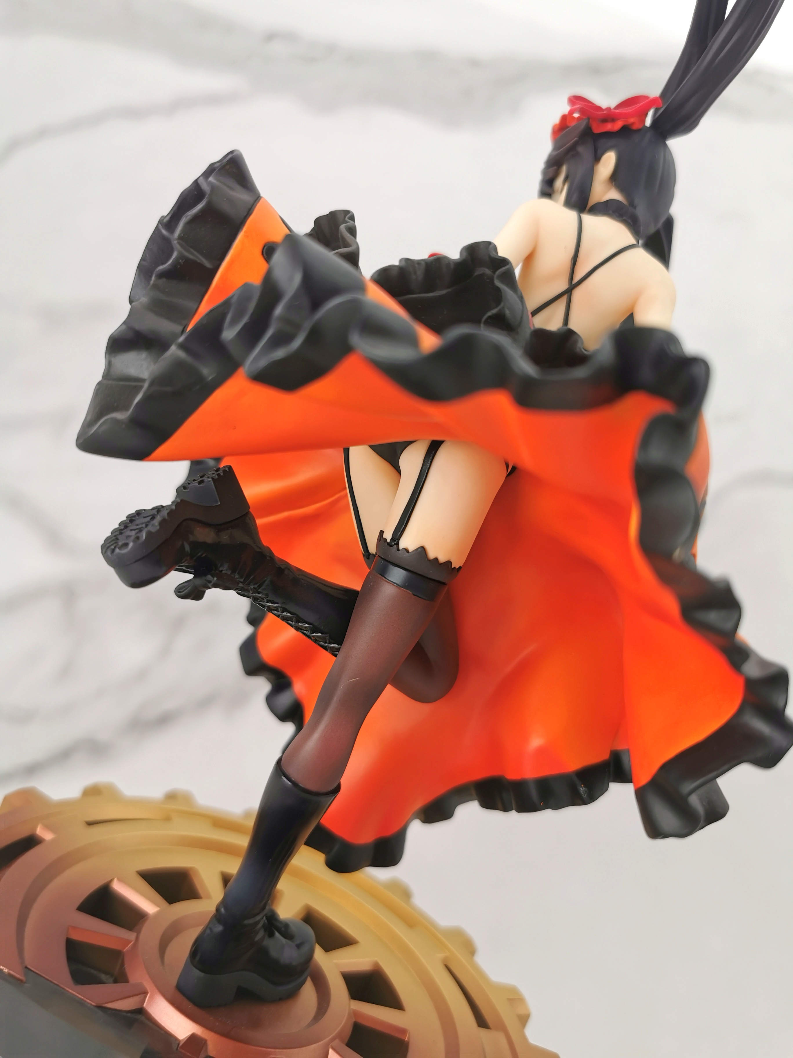 手办的造型是狂三踩在一个巨大的齿轮上,类似于奔跑一样的姿势,忽然间提裙回头甩了一个眉眼