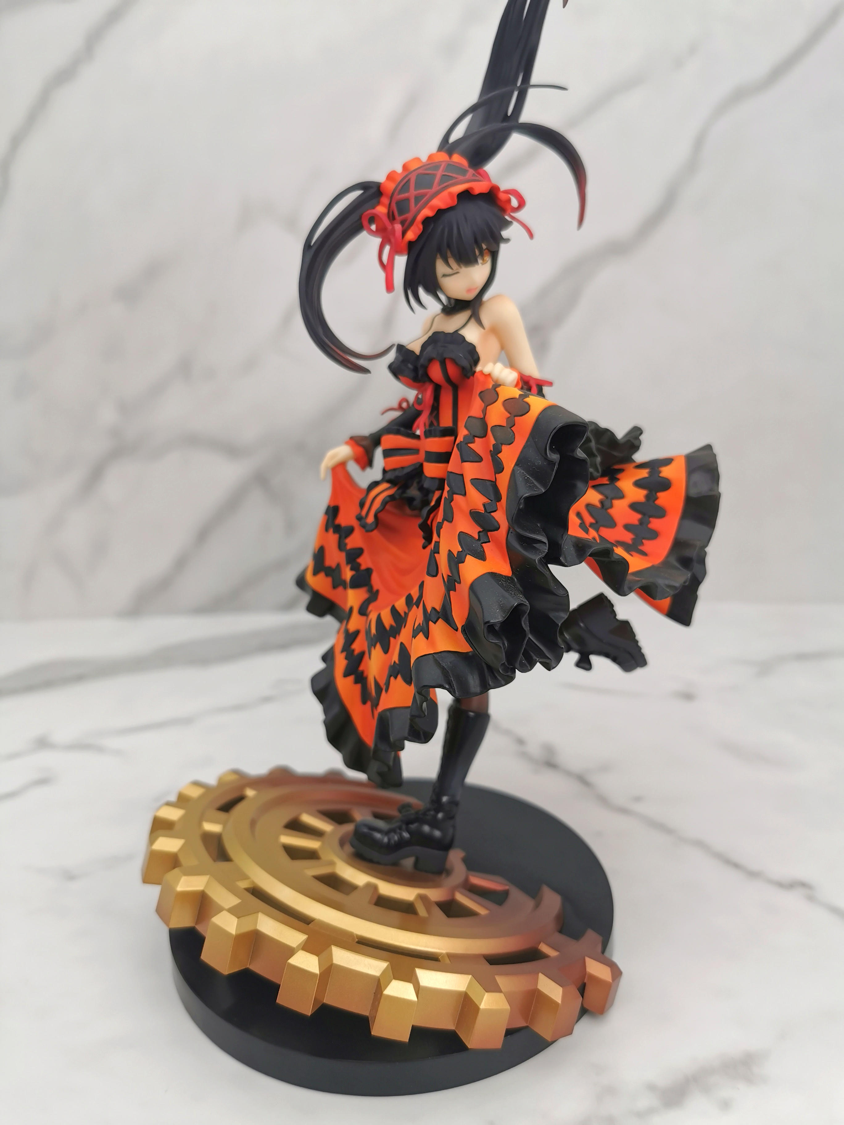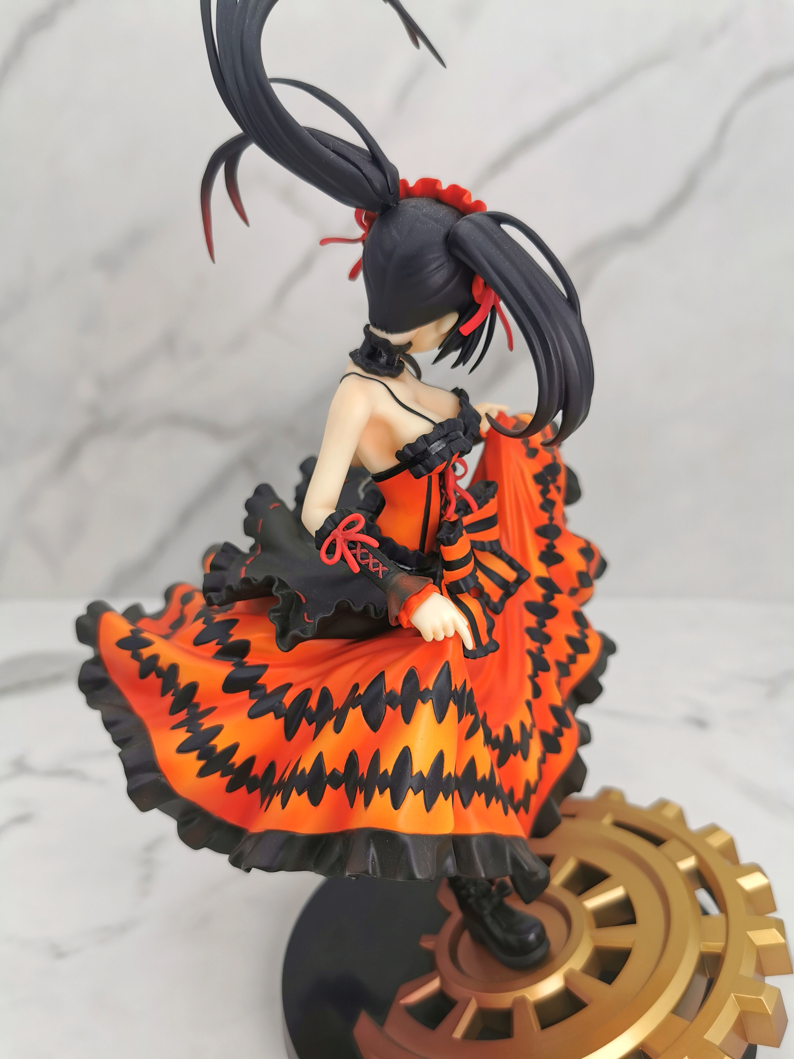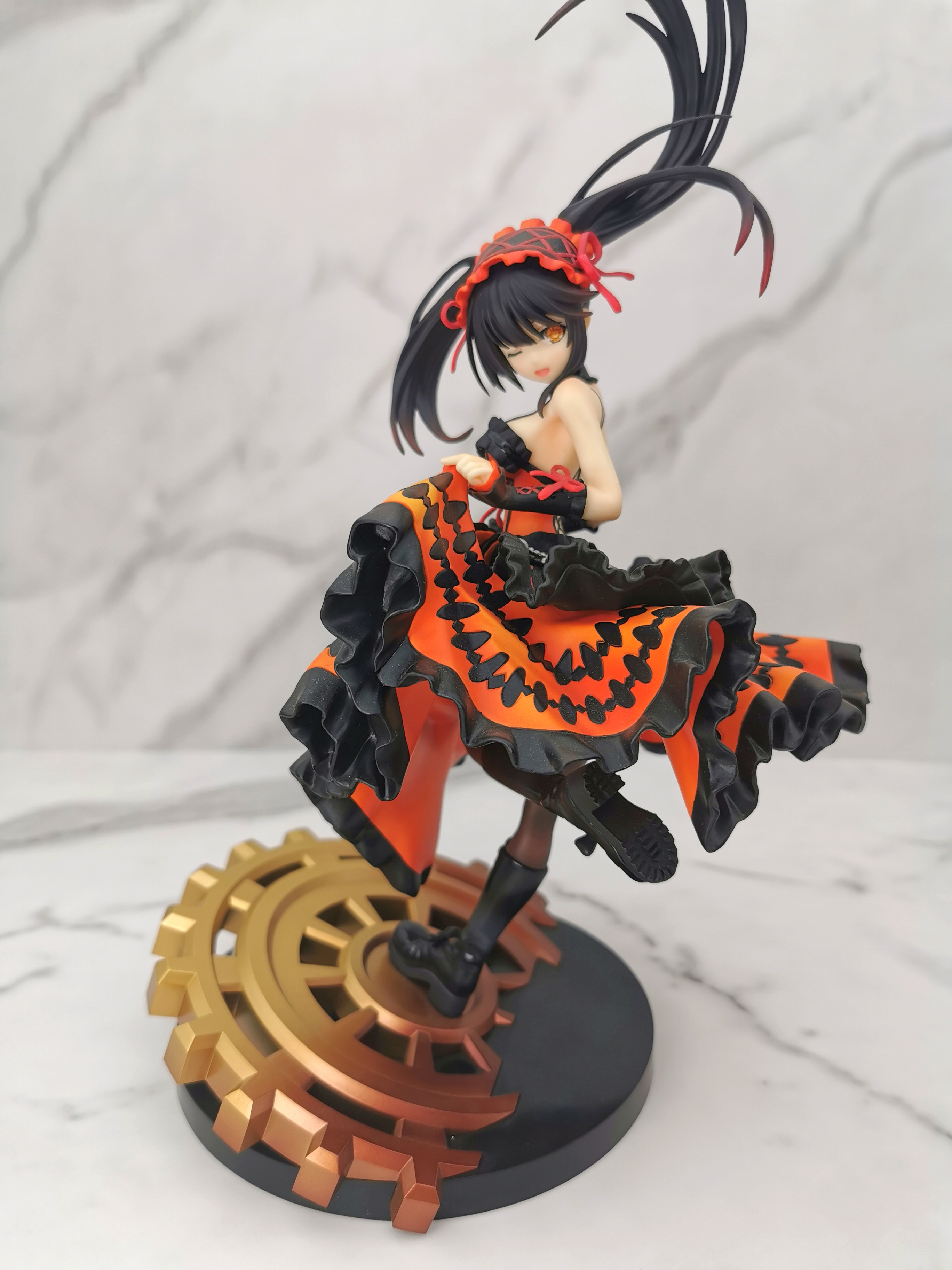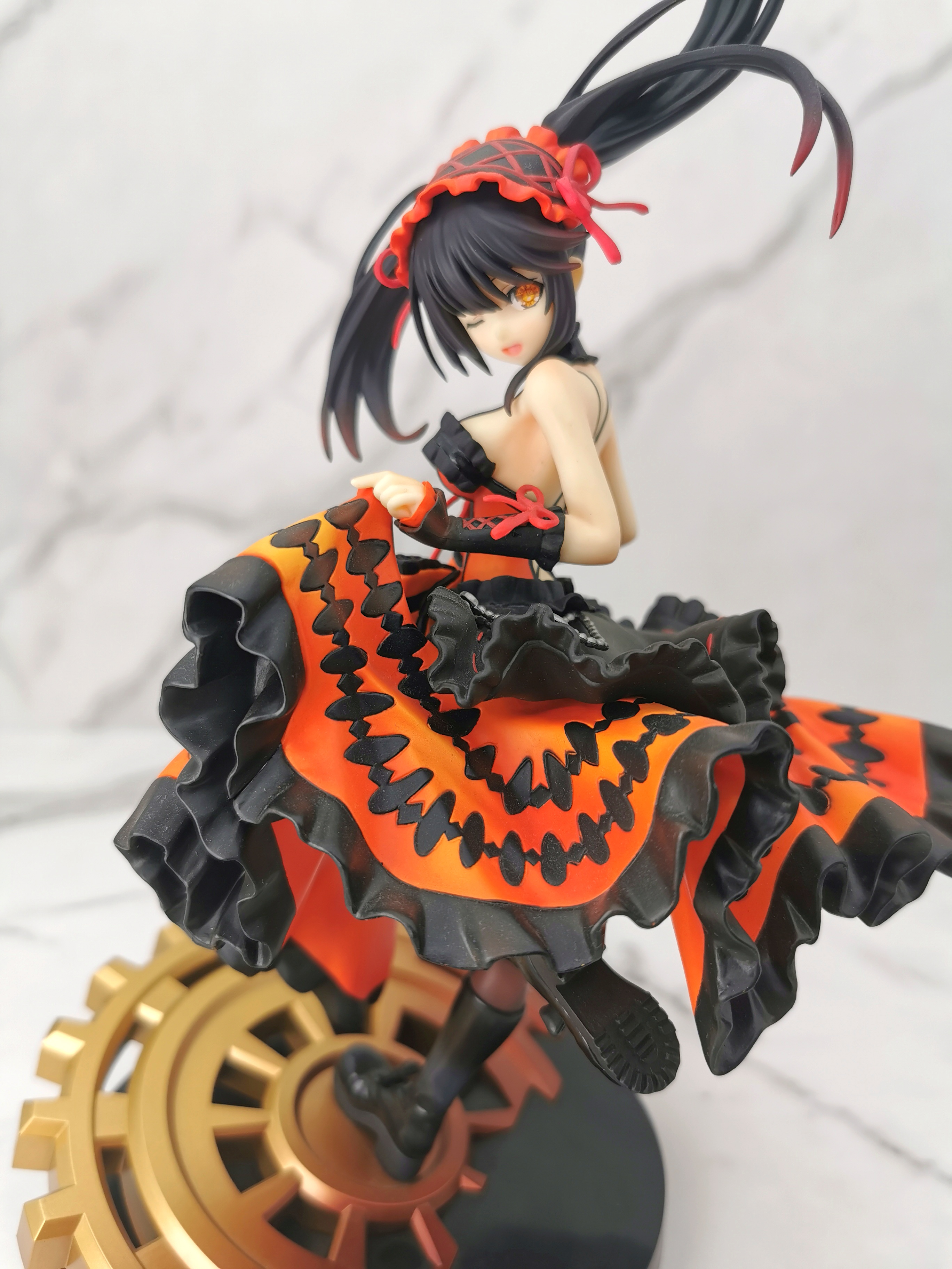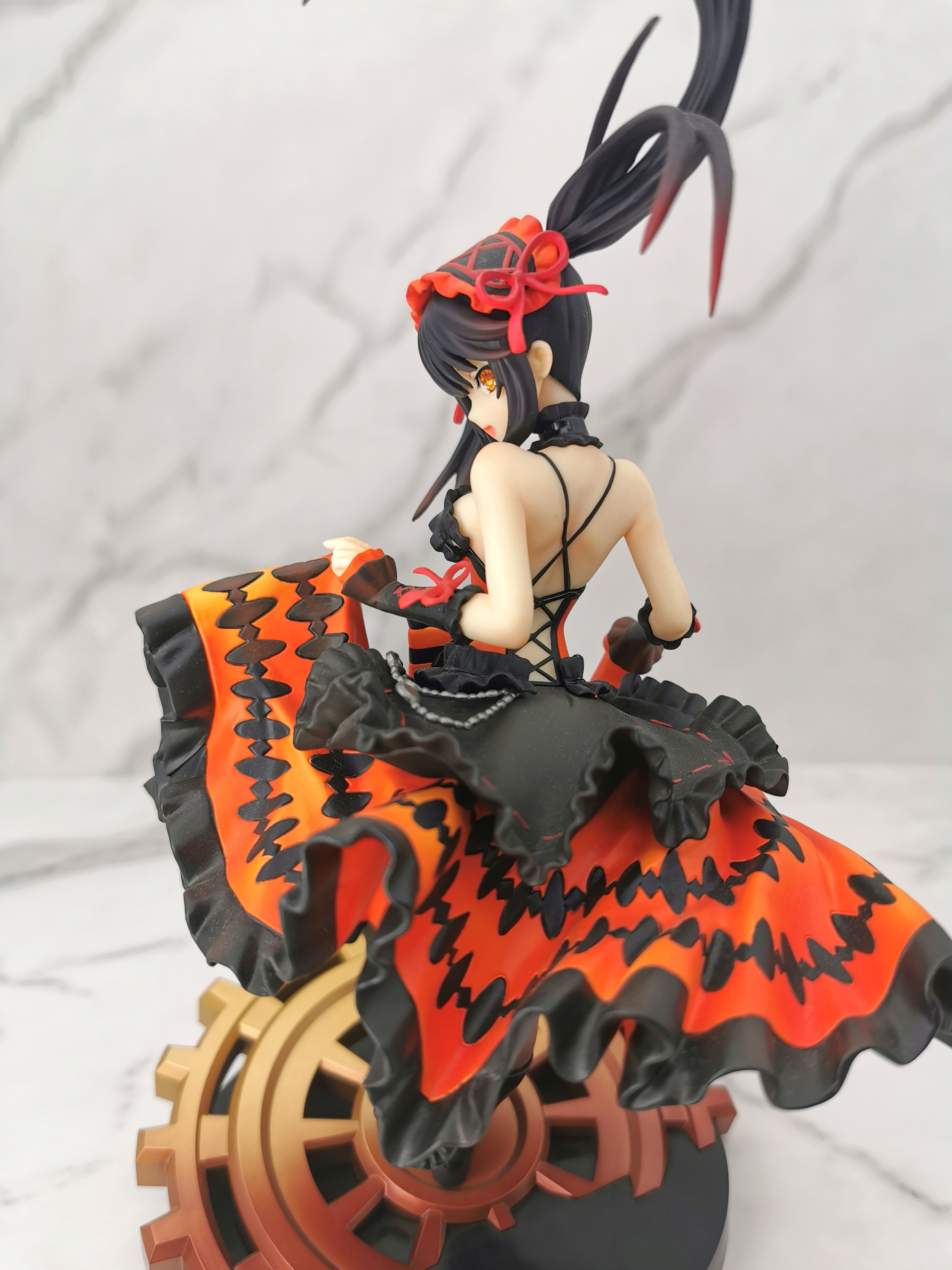 手办的造型是狂三踩在一个巨大的齿轮上,类似于奔跑一样的姿势,忽然间提裙回头甩了一个眉眼