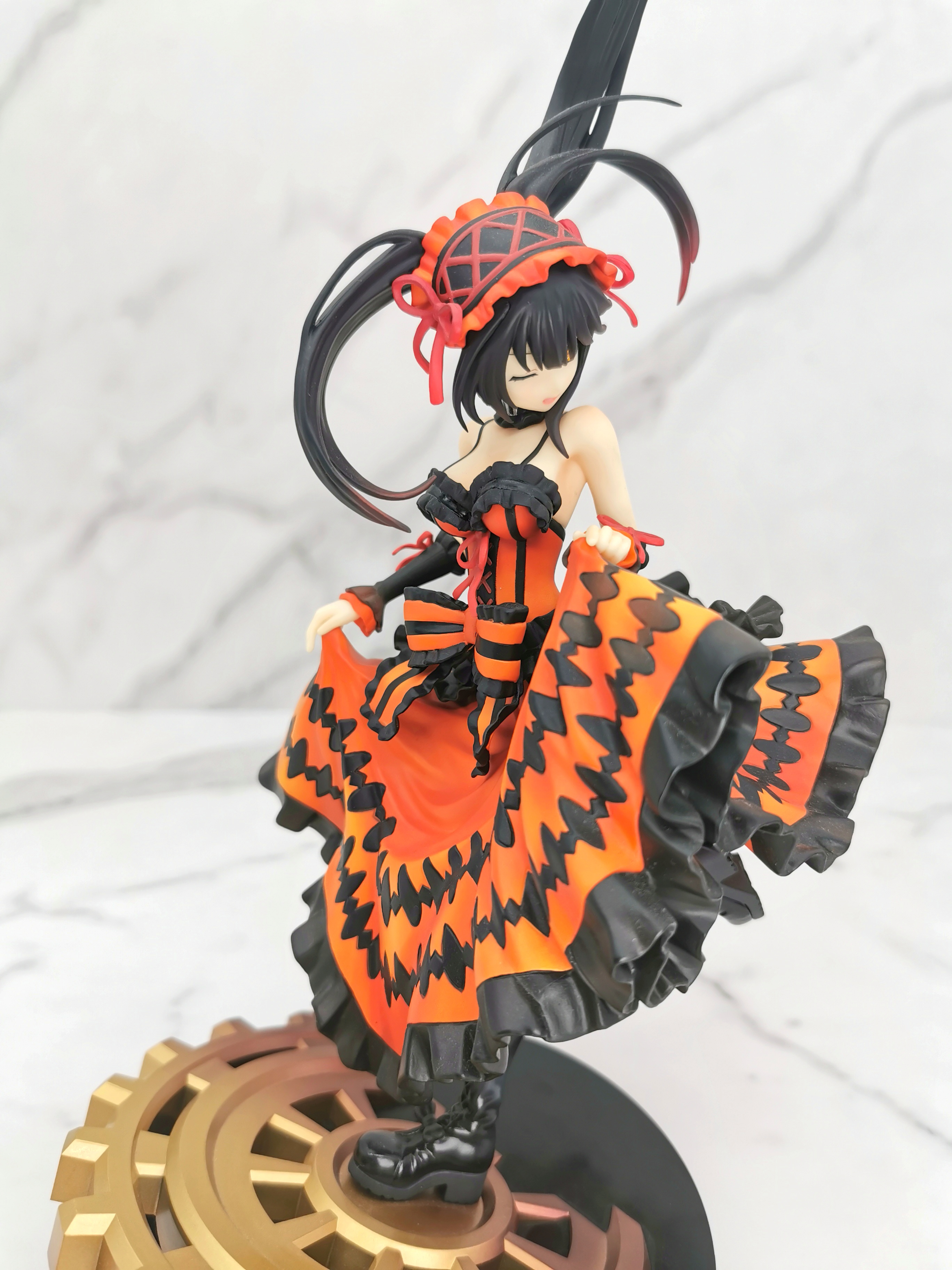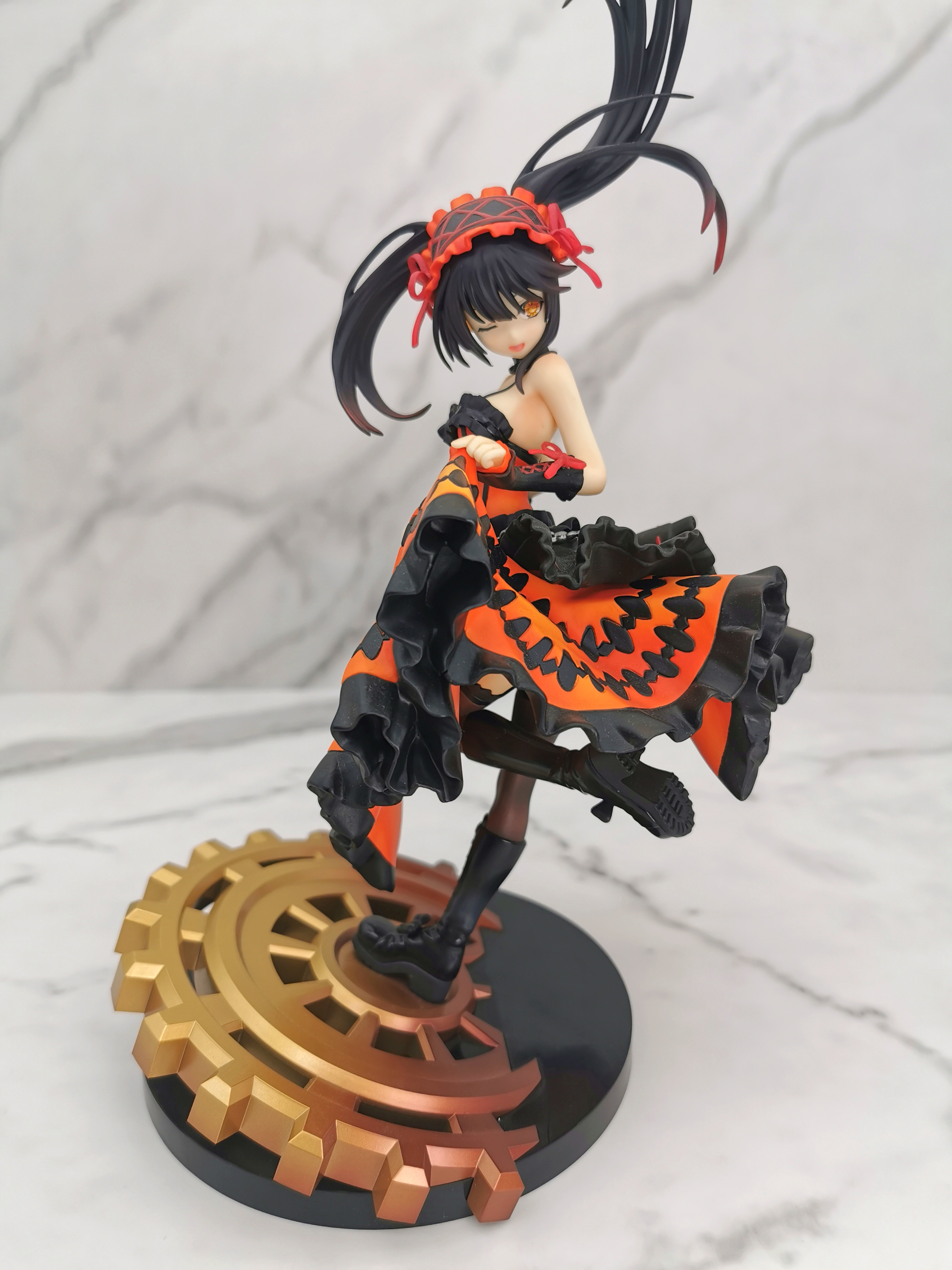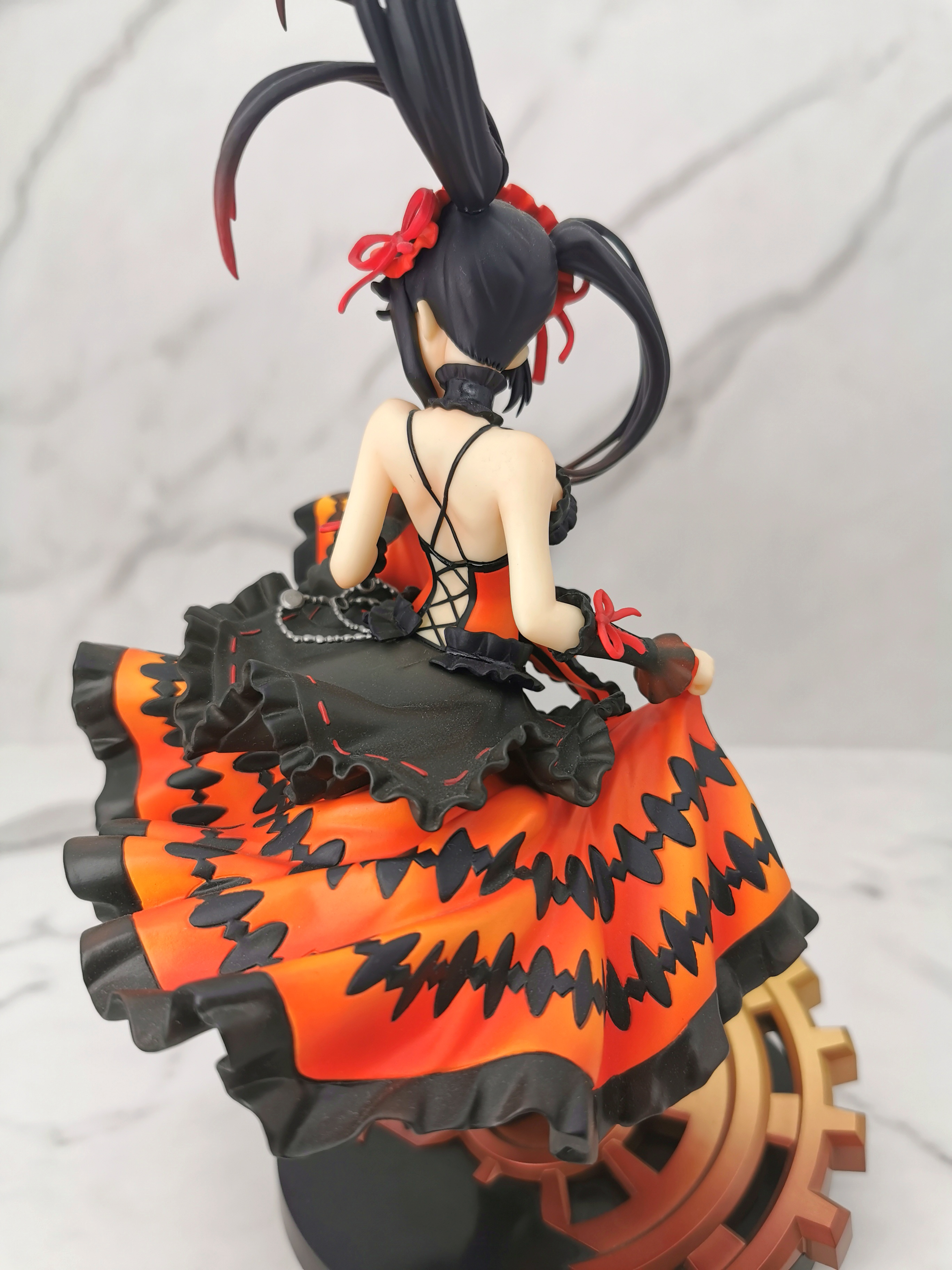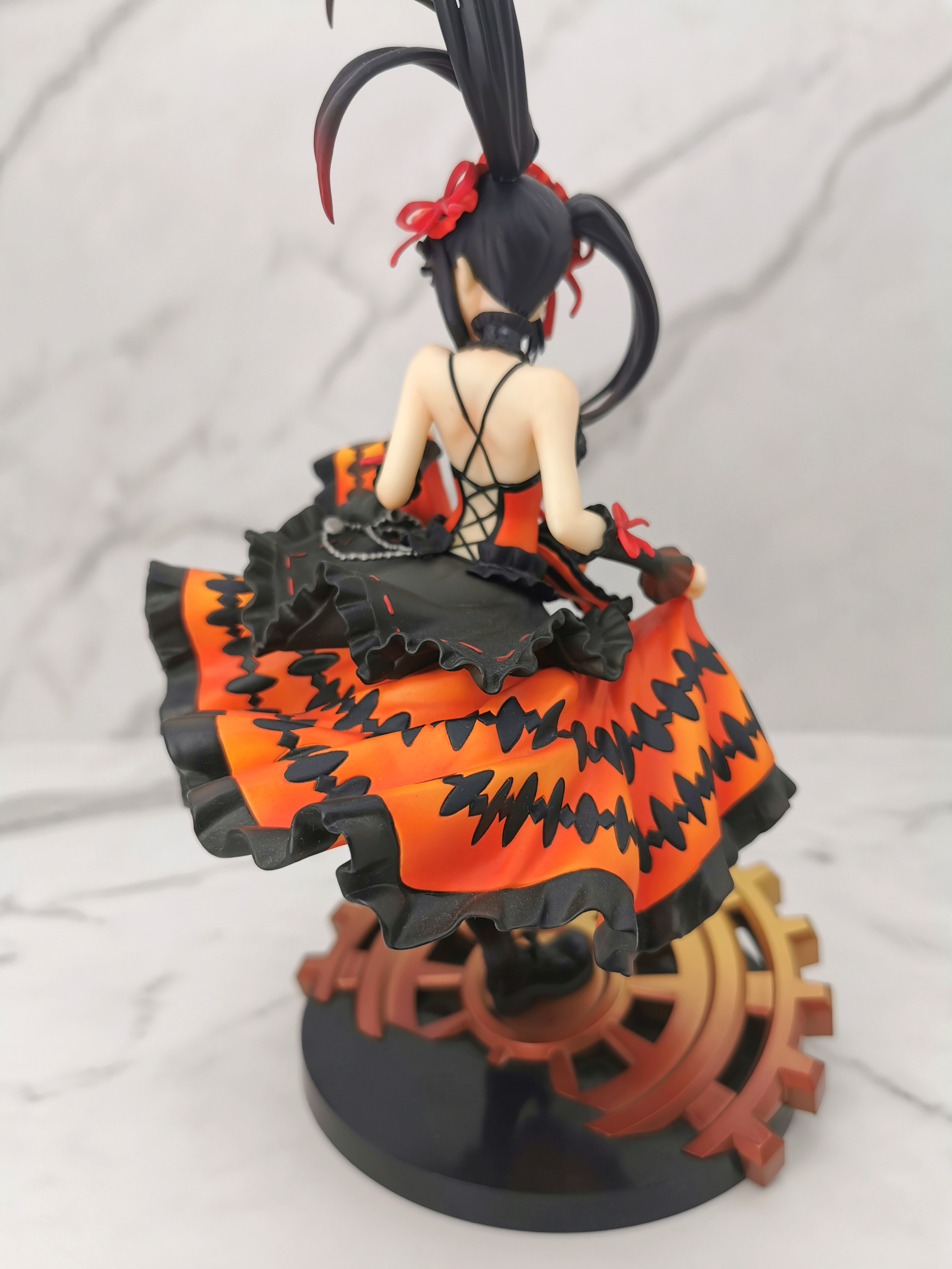 手办的造型是狂三踩在一个巨大的齿轮上,类似于奔跑一样的姿势,忽然间提裙回头甩了一个眉眼