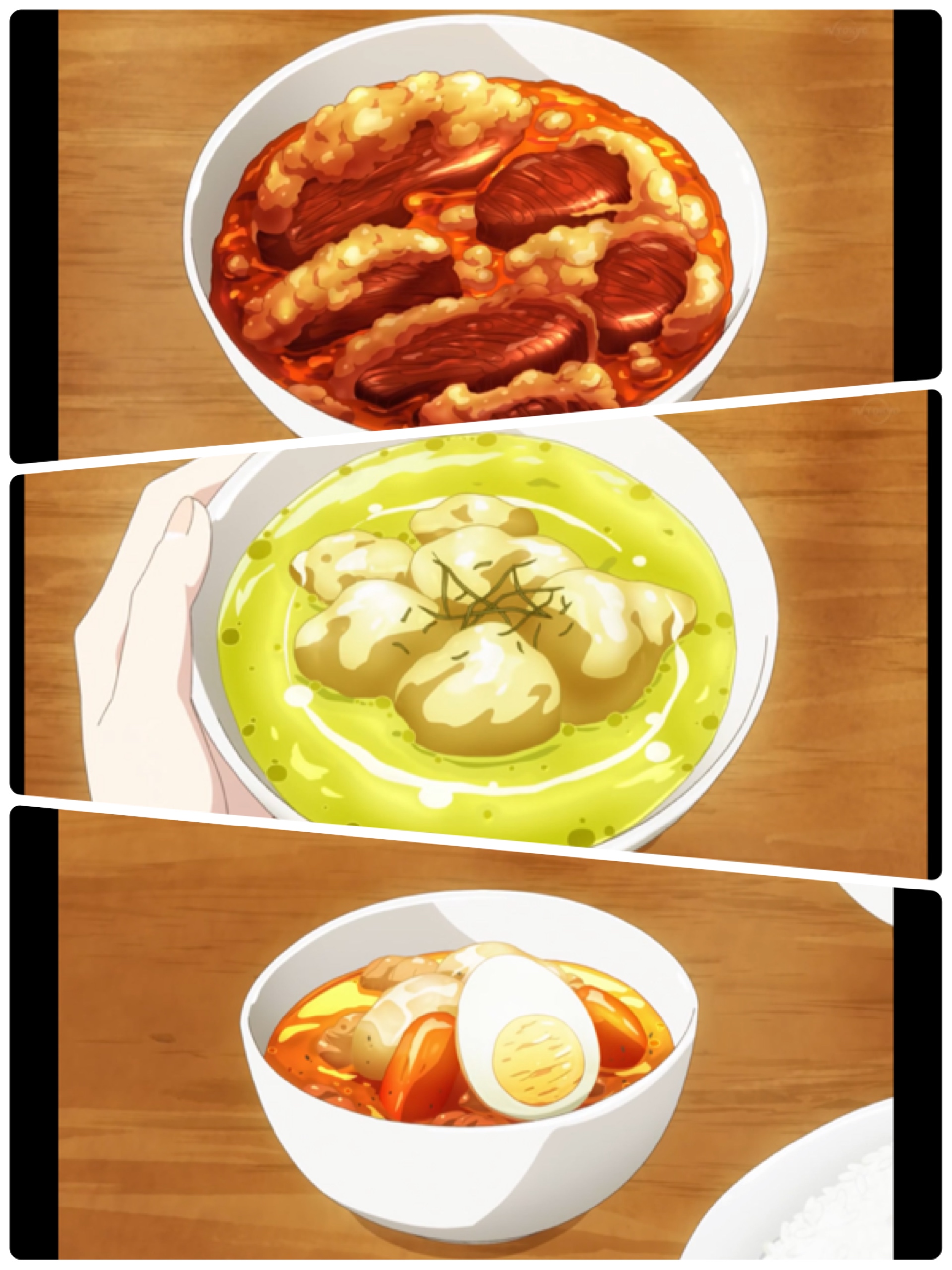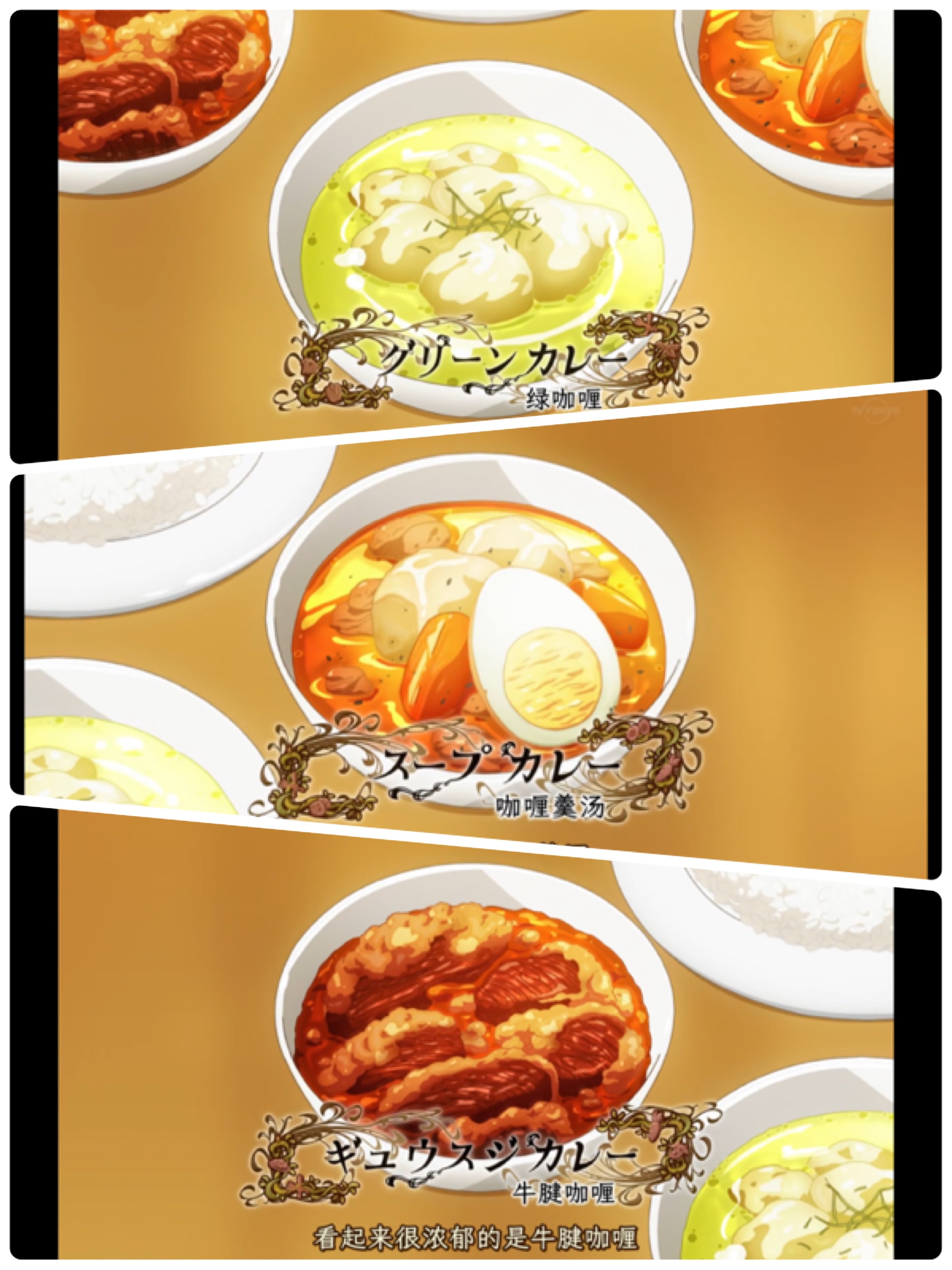 [查看图片][查看图片] 第三話中,又出現了愛吃咖哩的阿爾馮斯先生~ 對於喜歡咖哩的人,也不會錯過這機會,聊聊天的! 你們喜歡什麼樣式的咖哩呢o(≧v≦)o 我比較喜歡的是....『蕃茄日式的咖哩』~ [查看图片] 這款的咖哩有點甜甜酸酸的, 吃下去會有小小蕃茄果肉和薯仔的小果粒 算是~比較開胃口的咖哩~【推薦~