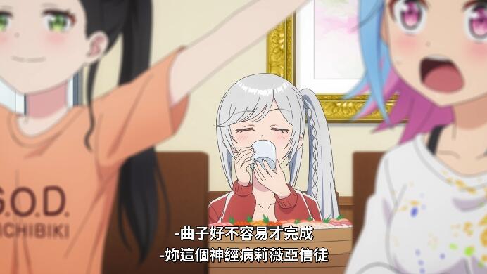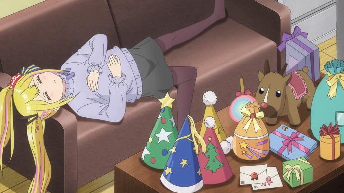 就在这时,莉薇娅也是拿着礼物(并且换上了圣诞老人的服装)来给莎拉送礼物了(至于礼物是啥,其实前面几话就已经有说过了——是莉薇娅的手办,很明显是在圣诞节之前成功地将第一批制作了出来()