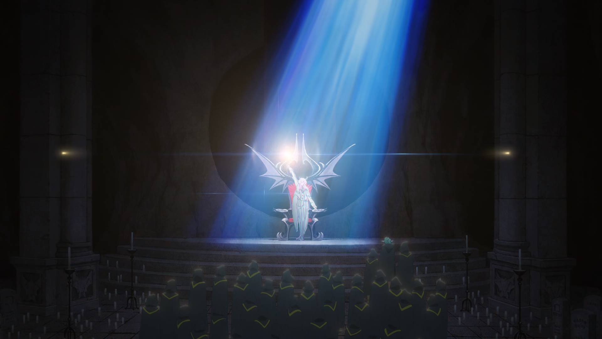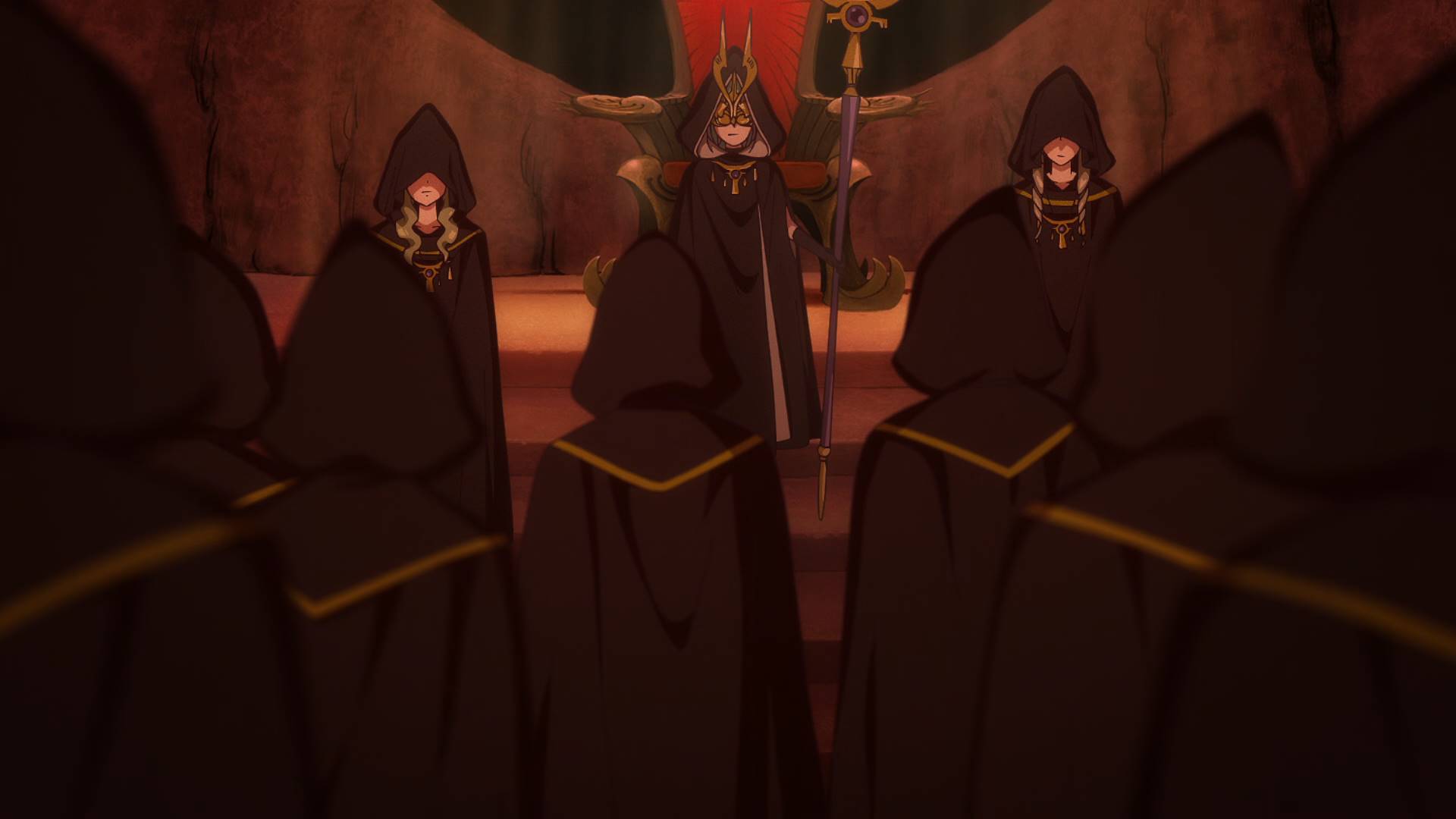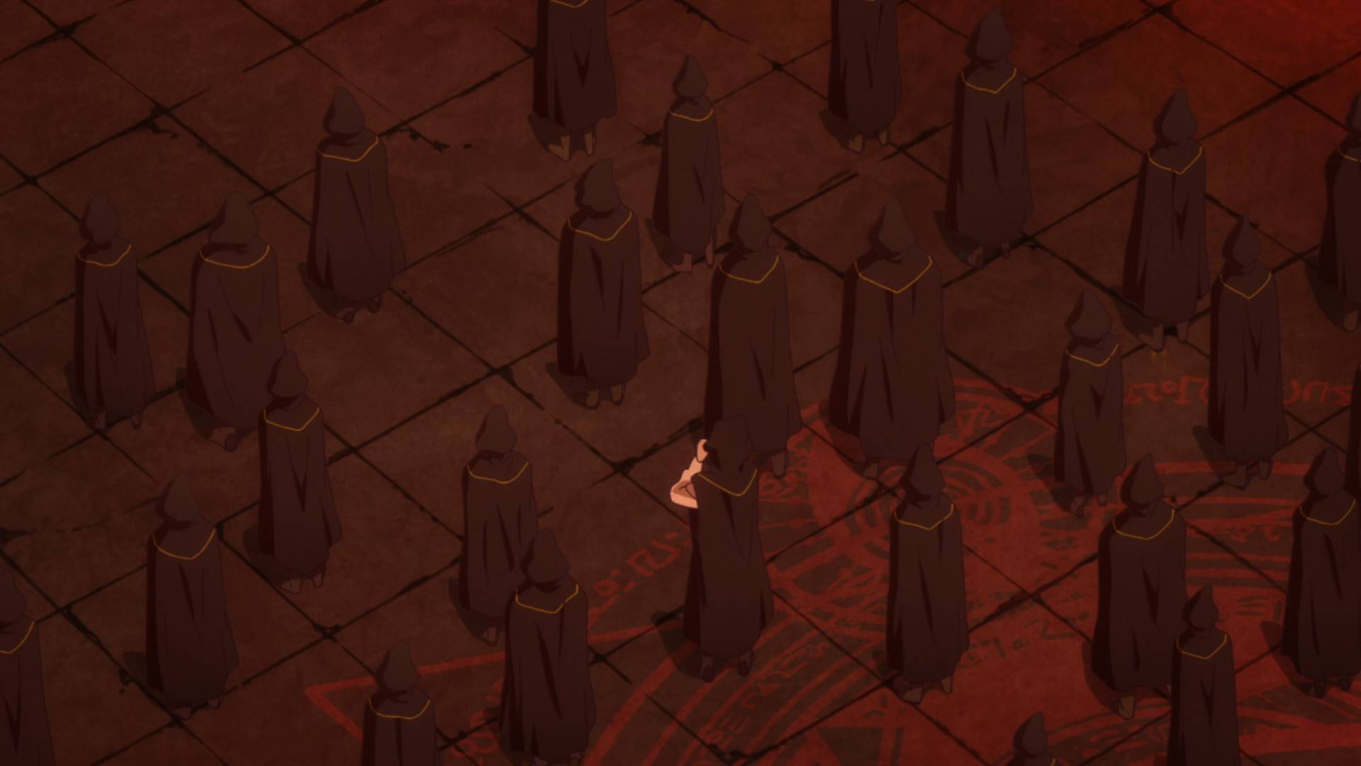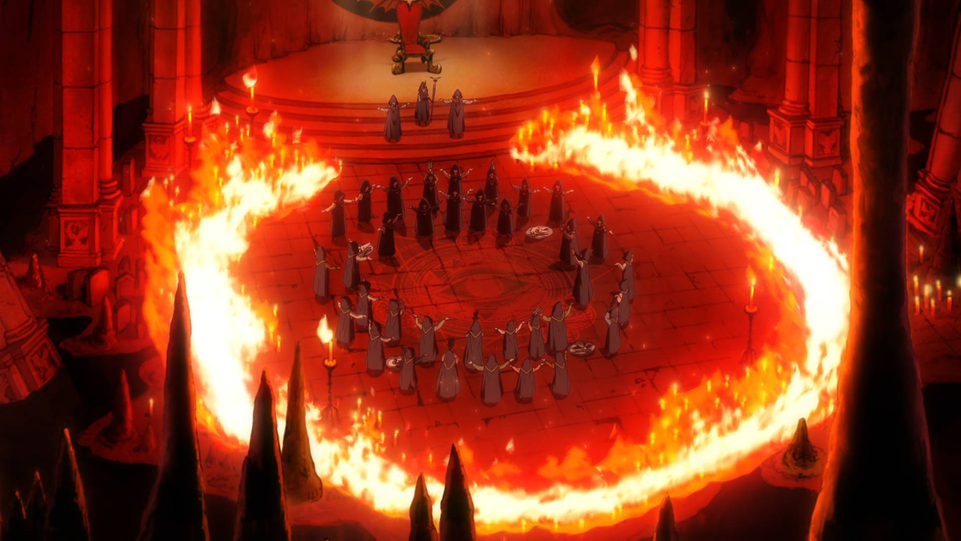 一群人穿着黑斗篷,周围烧着一圈火,围着一个魔法阵,在举行什么仪式的样子。