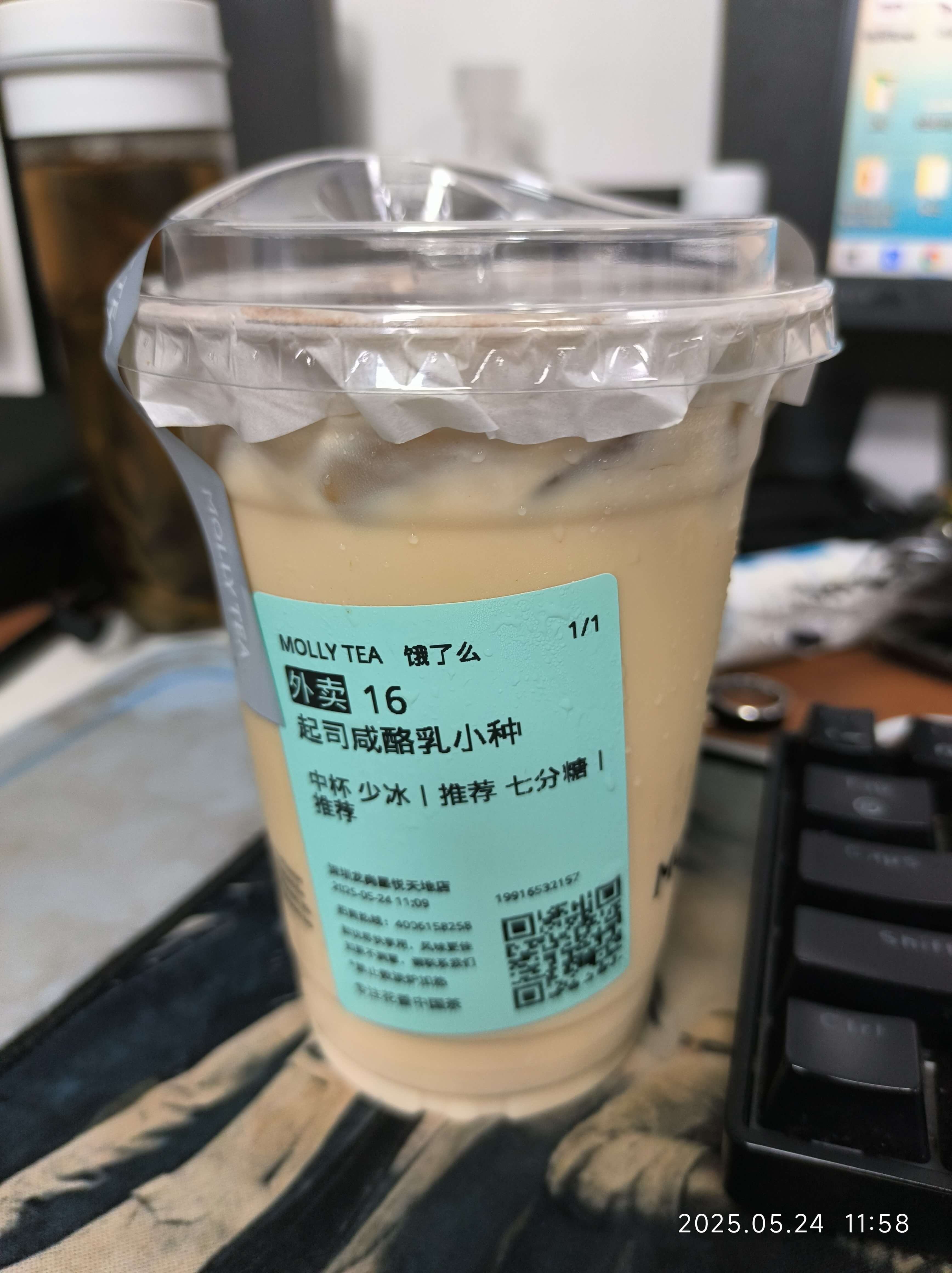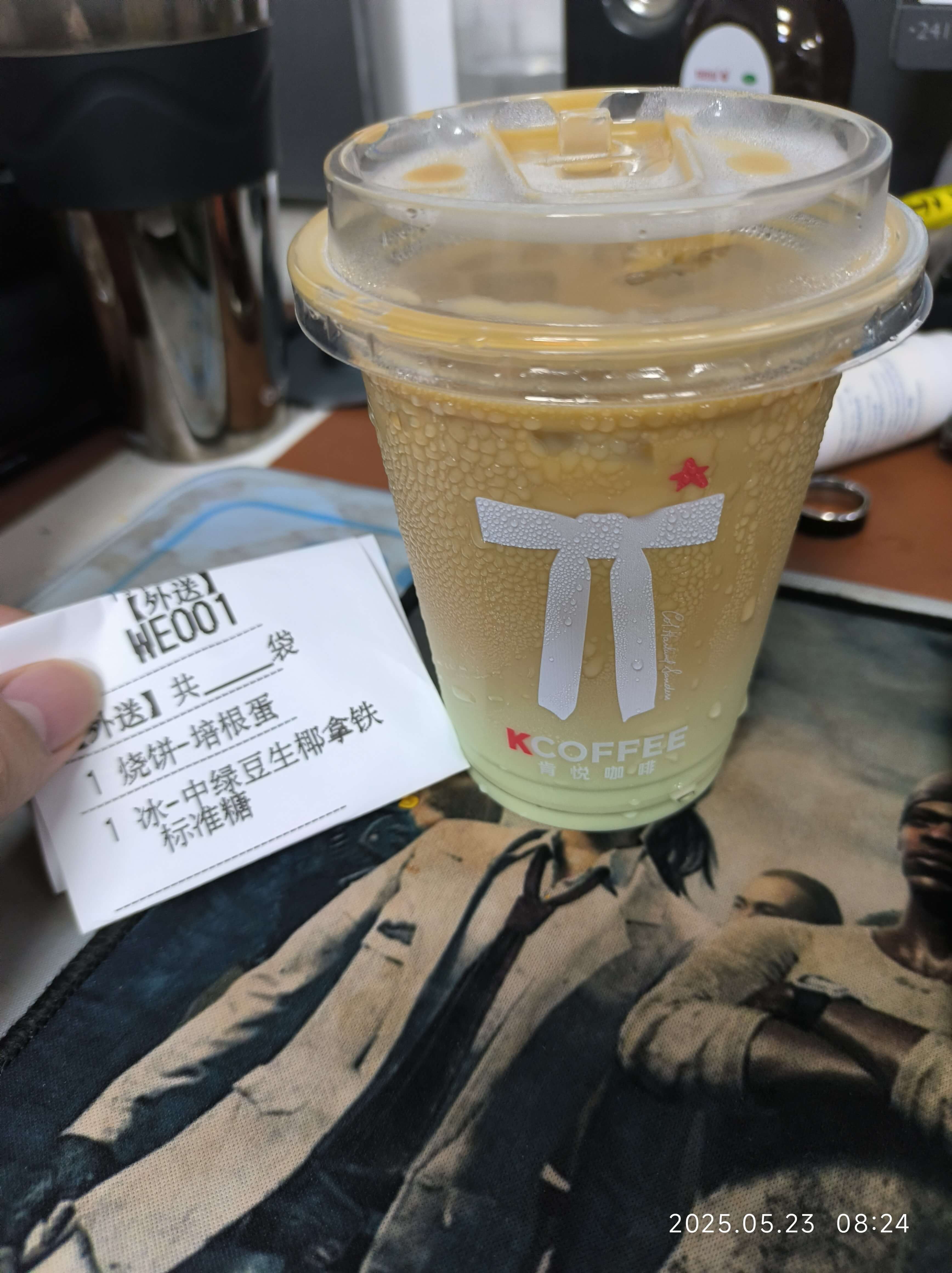 瑞幸上上个星期和多邻国联动了,也有一个绿豆沙拿铁。这两个属于不同走向。瑞幸那个我到时候发再说。肯悦这个是属于椰奶绿豆糕拿铁。