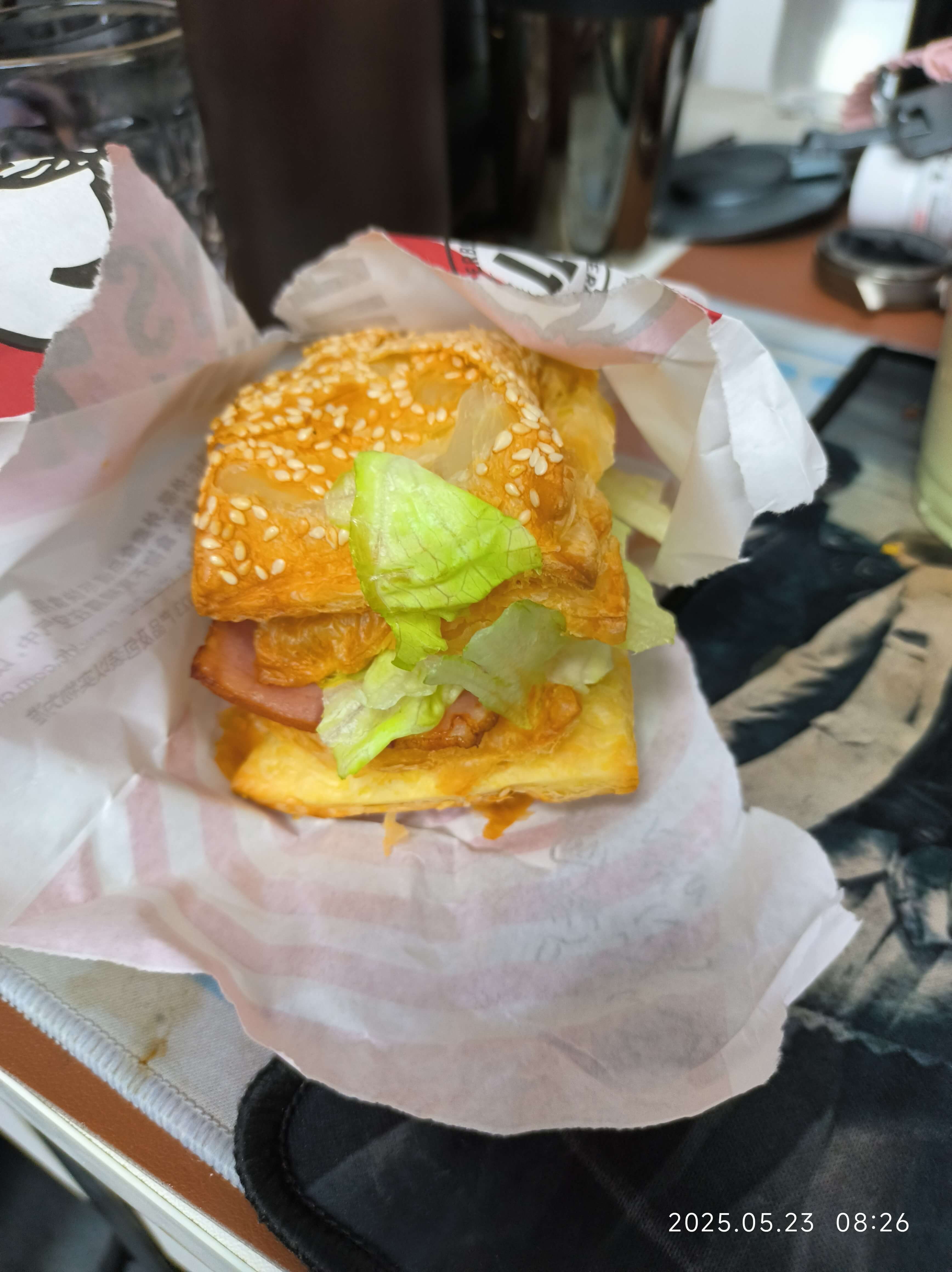 这个是kfc的一个早餐汉堡。名字我忘了。全是酥皮。一口下去没有面包。然后就是中间有培根和蛋。煎蛋还是花了2元加的