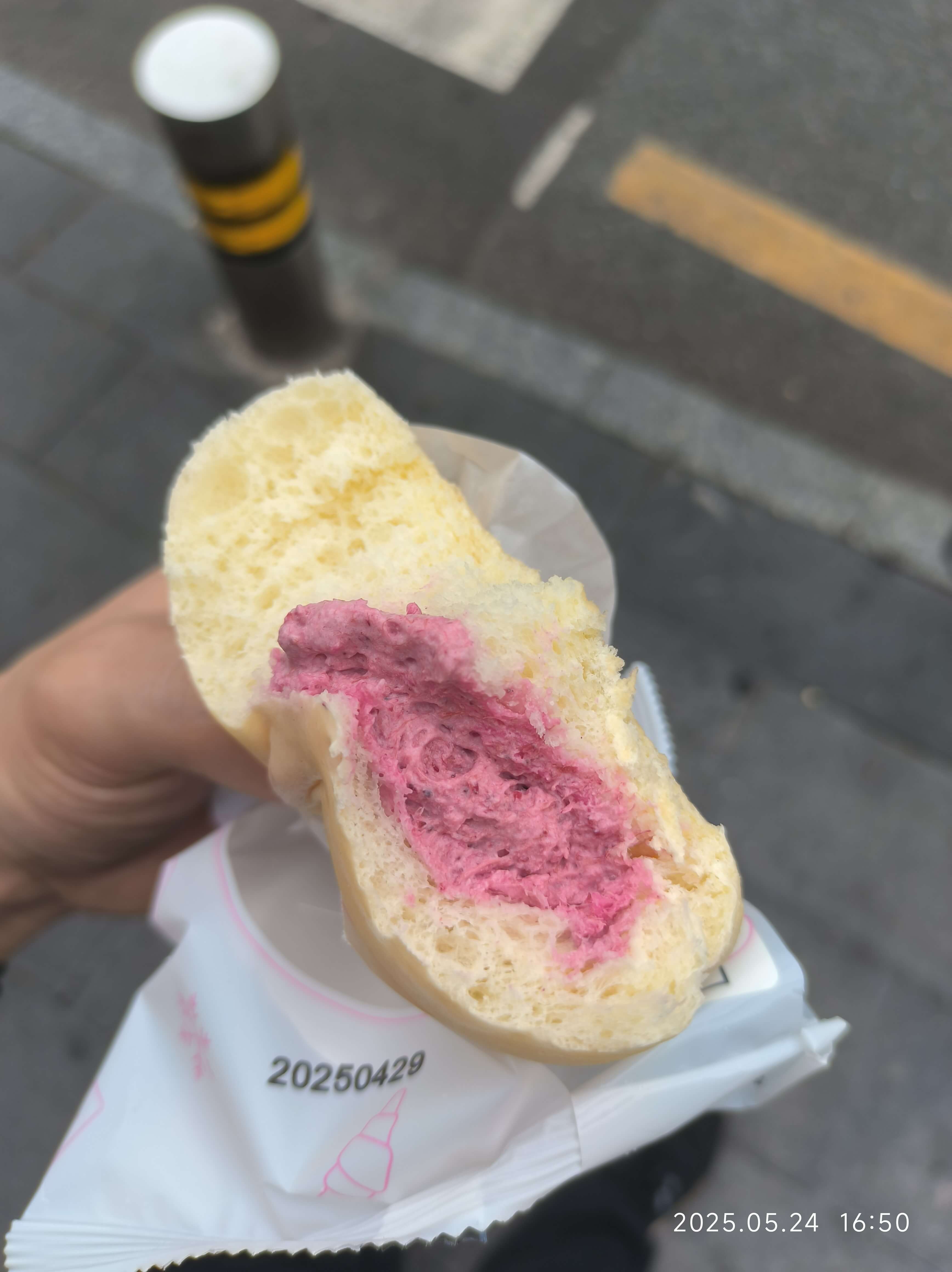 杨梅冰面包。那个杨梅夹心挺意外的。和吃那种杨梅冰软了一样。就是抱着杨梅啃。只是一口就没了
