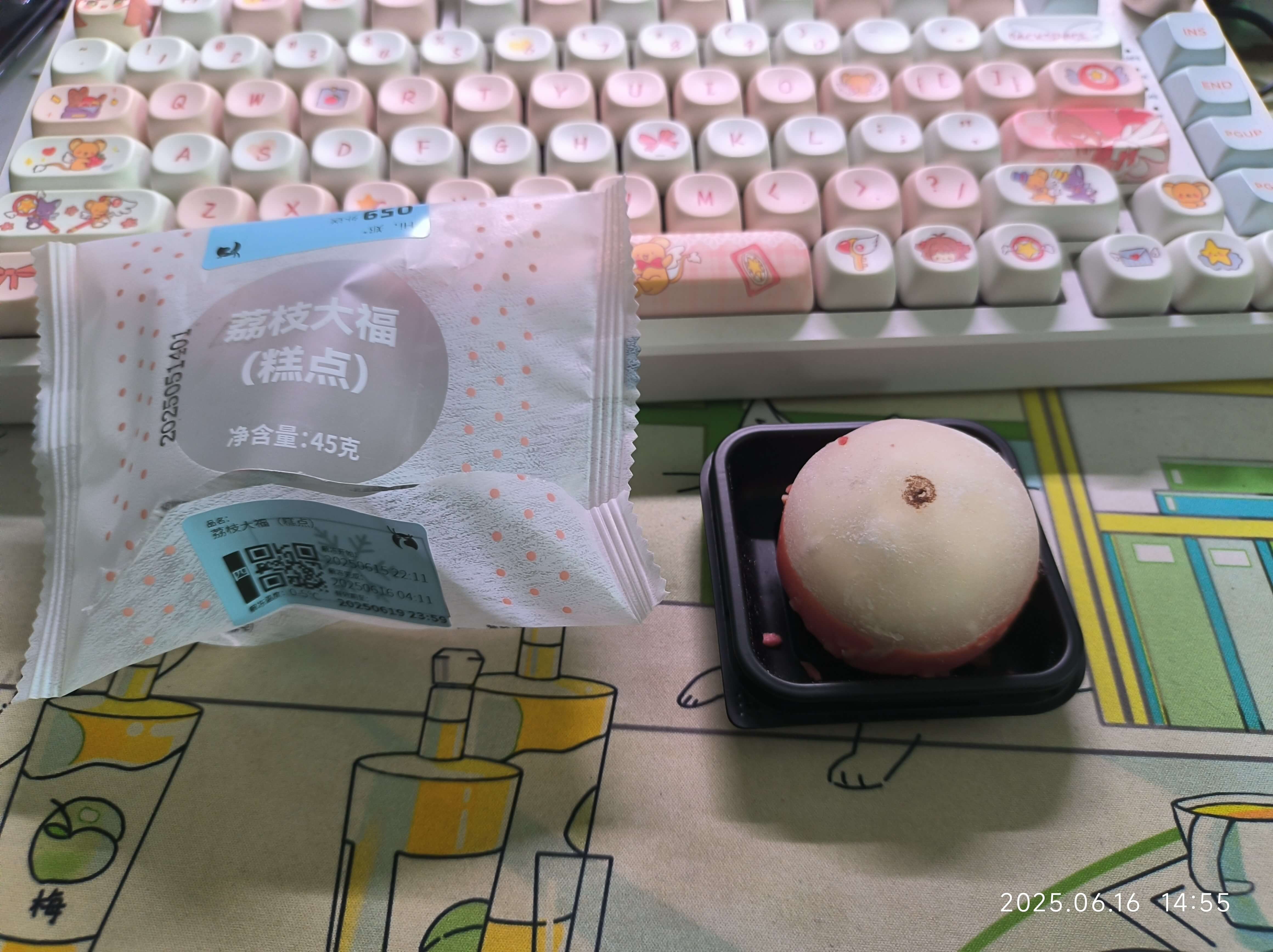 真的做的很用心。超像荔枝,底下的粉红巧克力是有渐变的,越到底部越红,上面的糯米皮是透明的,晶莹剔透。图片看不出来的缘故是,里面的白色荔枝味奶油填满了。上面的黑色点点是巧克力酱点缀的,中间有个很小的巧克力豆子鼓起来了一点点。
