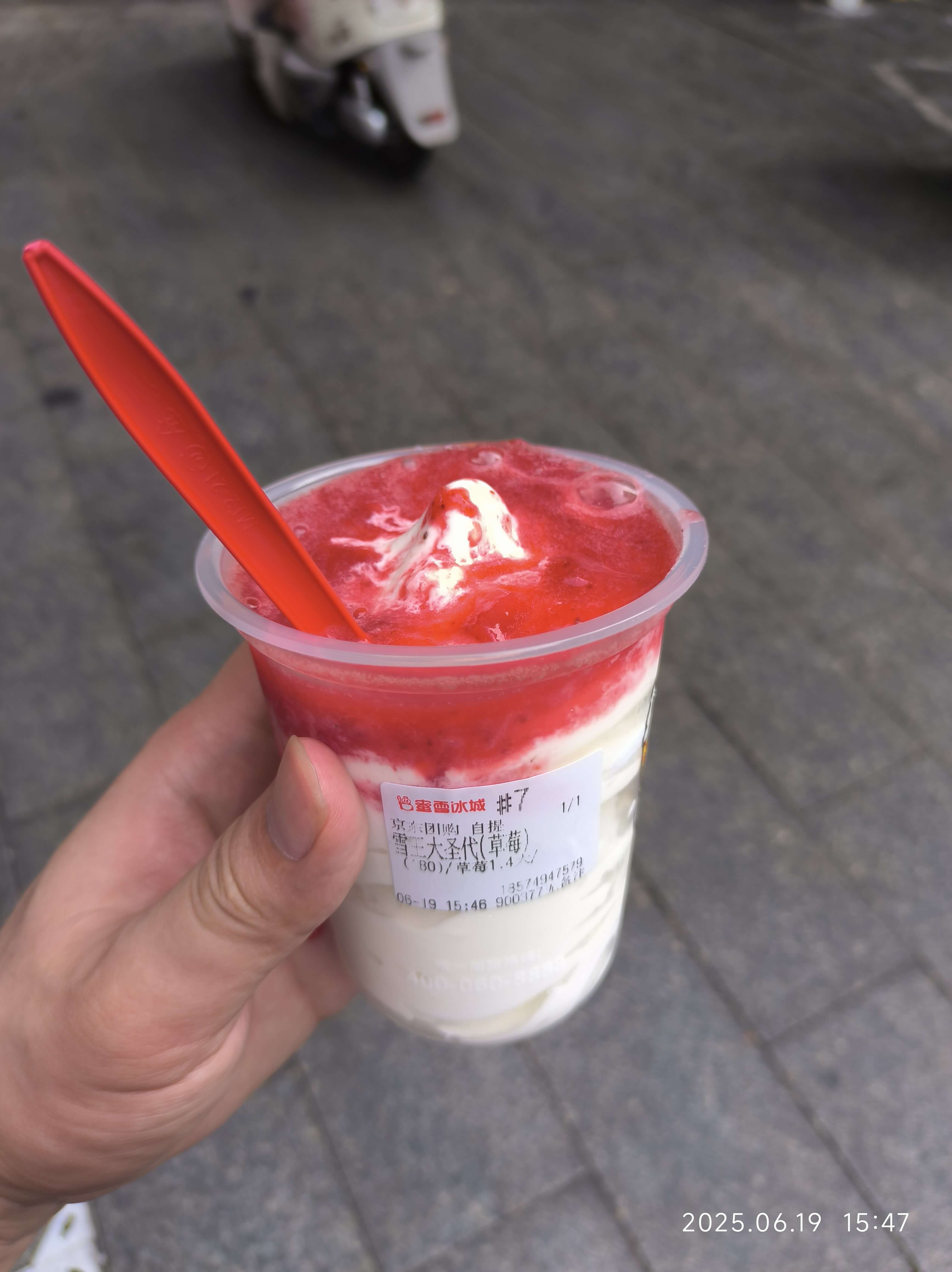 现在回想这个时候。有半价圣代吃。今天想吃雪糕,一发现原价。算了算了。东西就是经典草莓果酱,含草莓果肉的那种。半价性价比肯定高,原价我肯定不吃。顺带一提,这是我第一次吃蜜雪的圣代