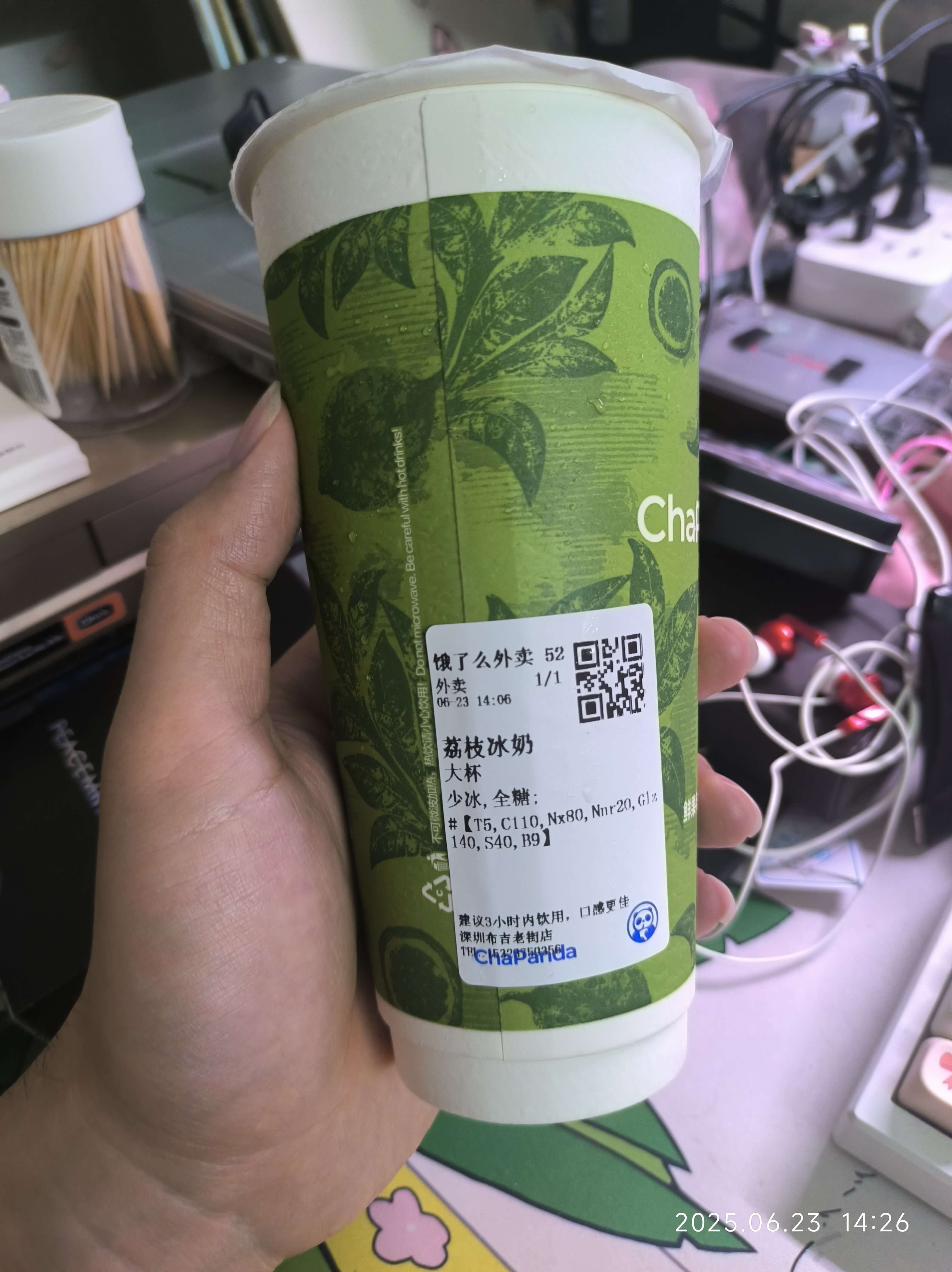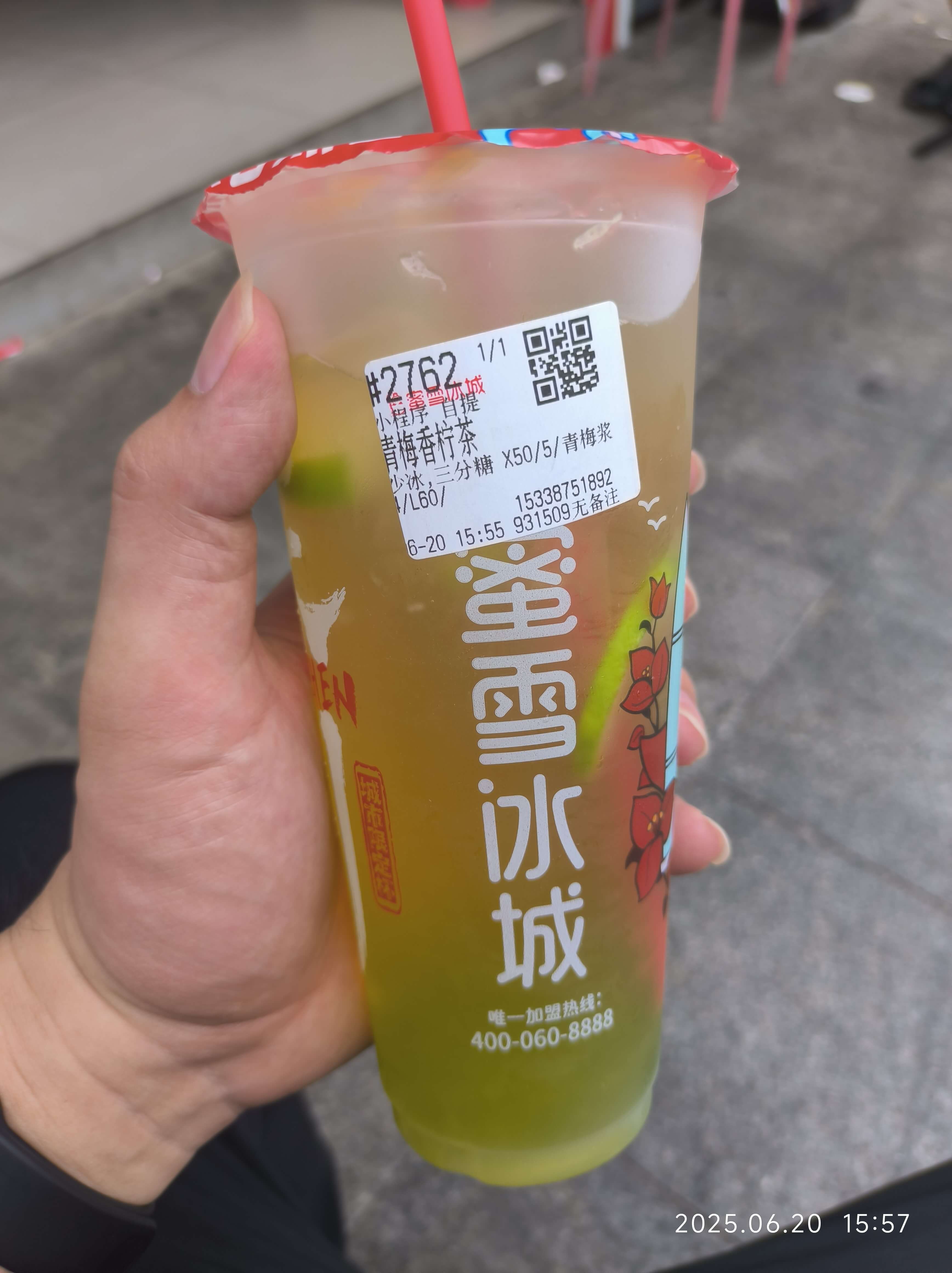 这个是原价买的。味道就是很普通的香柠的清香和青梅的酸甜,主要是青梅的糖浆糊底然后摇不匀导致上面都是茉莉绿茶的味道。下面甜不拉几的青梅糖浆