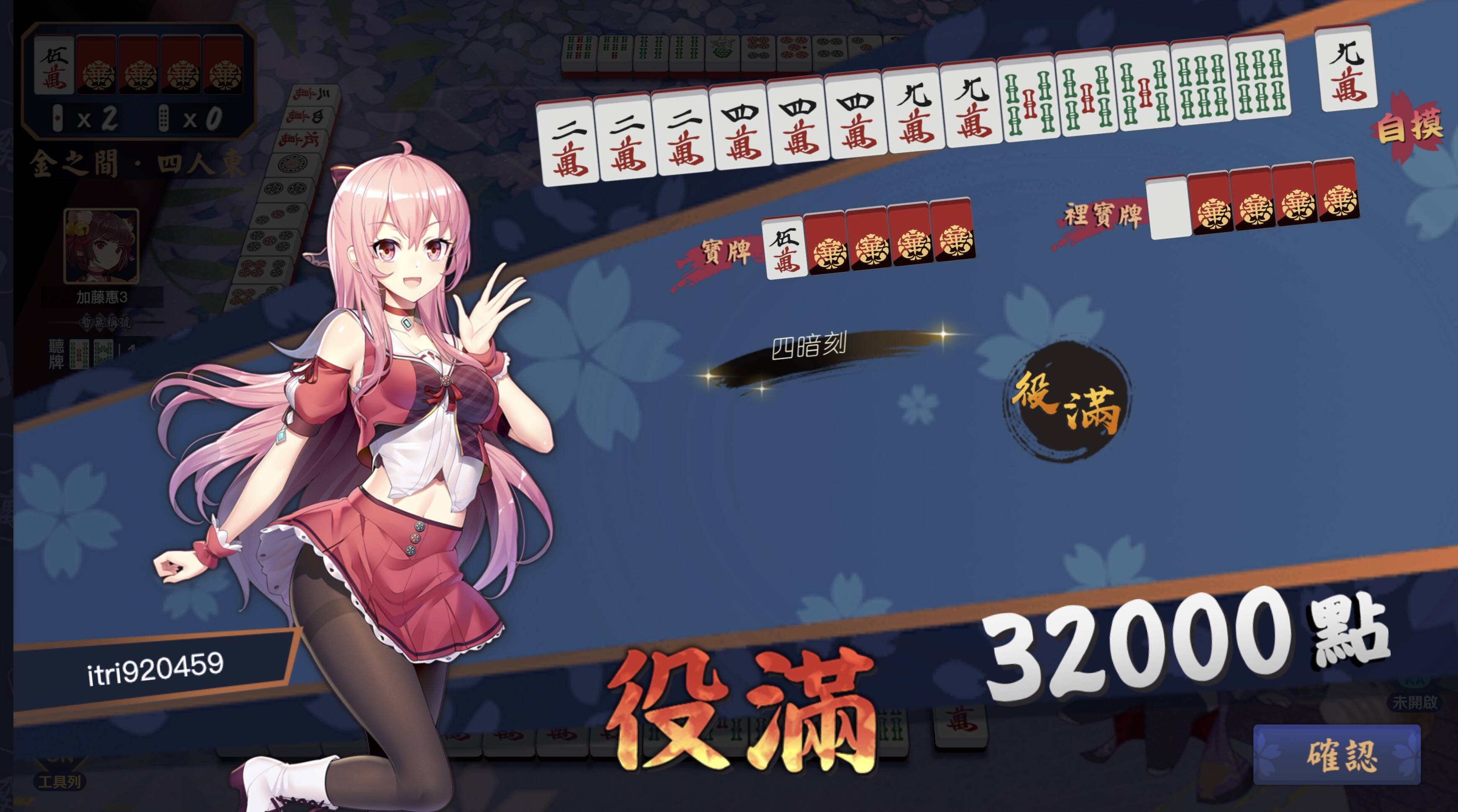 目前南四自亲,暂定31700的微差一位。这里对家打出了3s,似乎可以荣胡完场了……?但实战点下“和牌”按钮后,发现有一个超长时间的卡顿,然后才出现结算画面。众所周知,雀魂里胡牌是没有假卡的,那么只有可能是对家一炮多响,但有人见逃了。