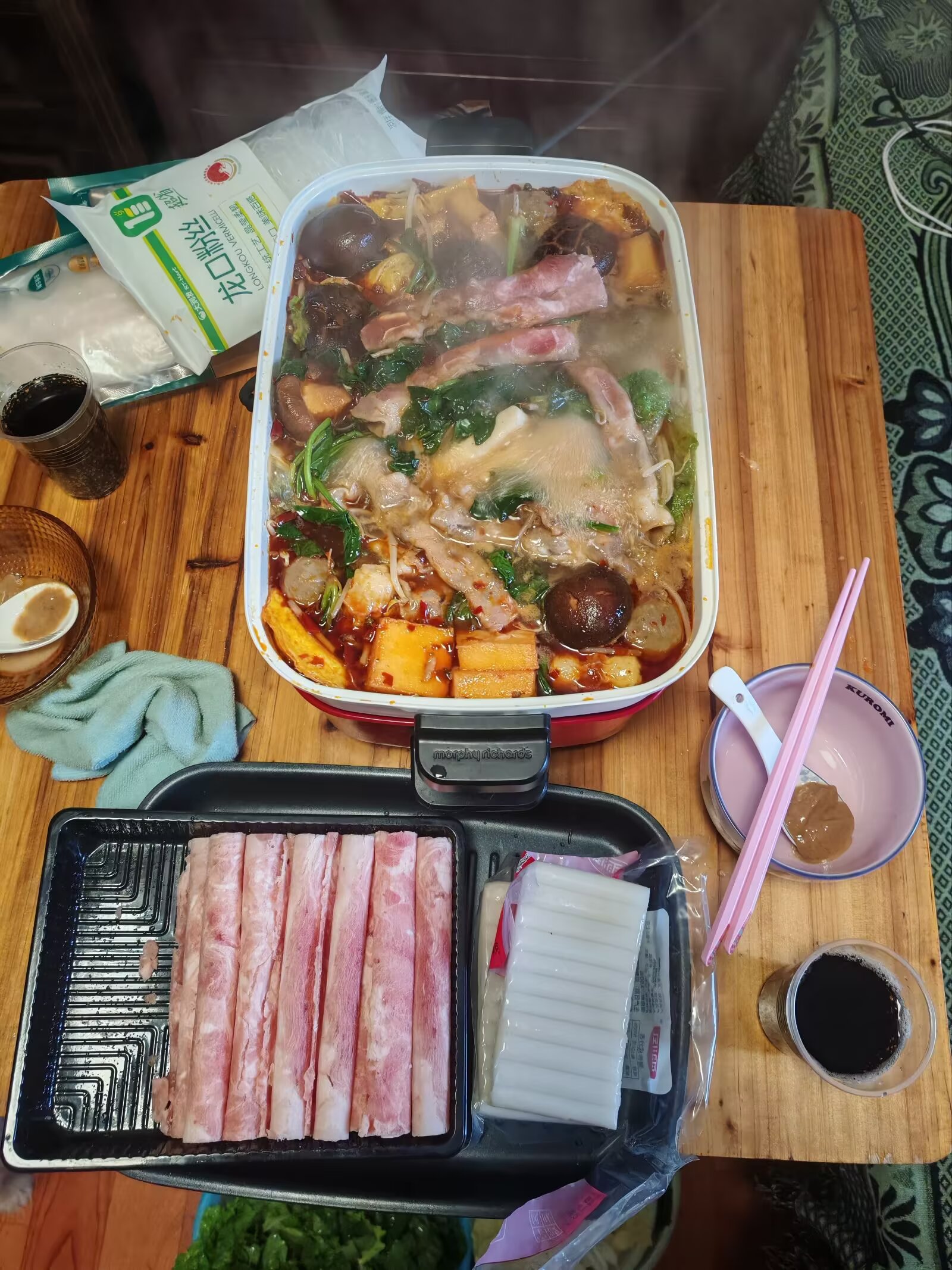 昨天家里还剩下菠菜,娃娃菜,看到这两个菜,立马想到可以丢火锅里,基本上麻辣烫里面放什么,火锅都可以放,所以刚刚大润发买了点火锅的东西,汤底,蘸料,年糕,鸡毛菜,生菜,巴沙鱼,鱼豆腐,牛肉丸,贡丸,绿豆芽,羊肉,香菇,粉丝等等,80块上下,差不多100,家里吃可以2-3人吃,最起码可以吃两顿,中午和晚上,所以100算下来还是比较经济实惠的,如果店里吃,2-3人的量,一顿,我感觉起码150+是需要的,按照上海这物价。