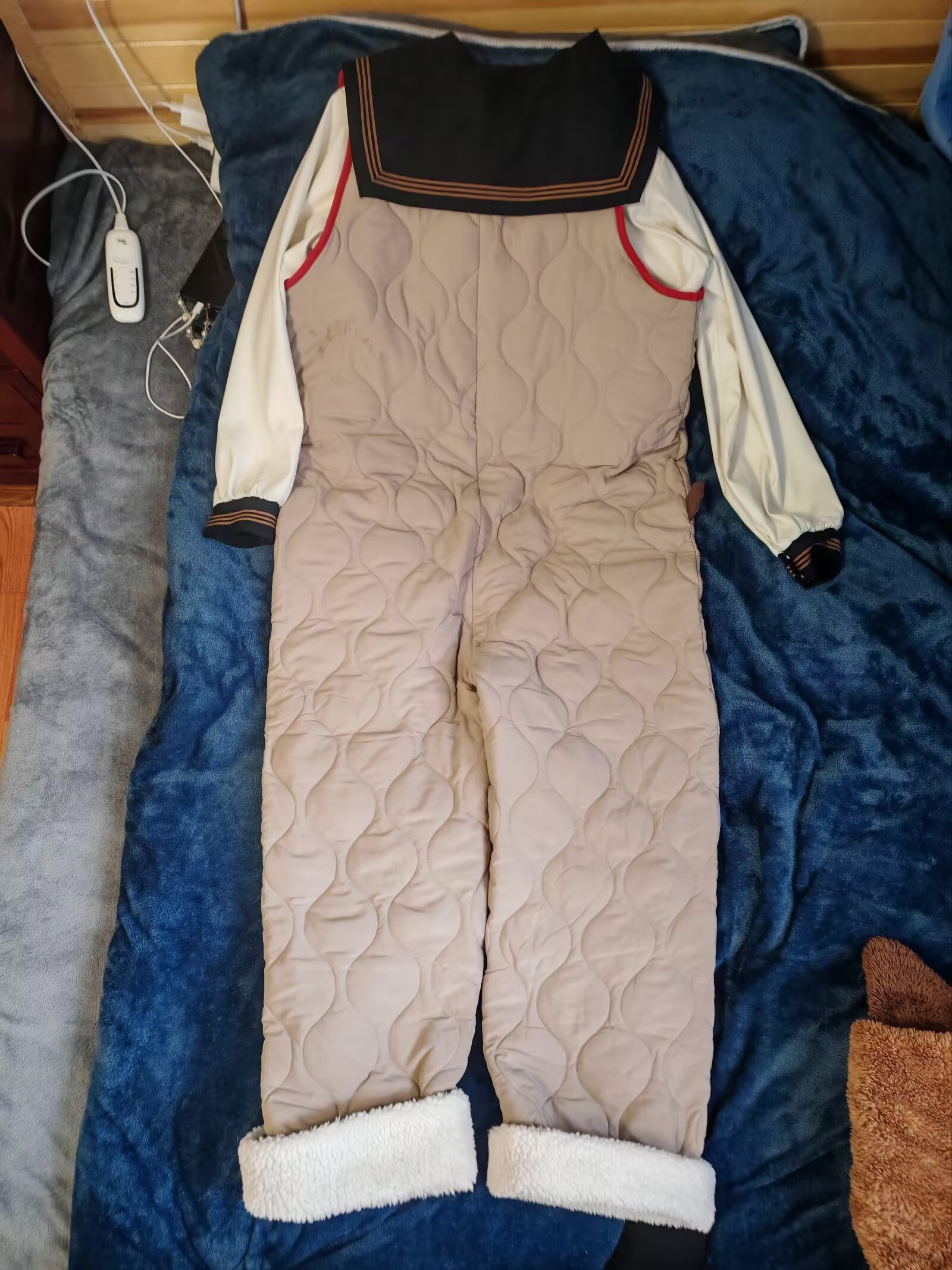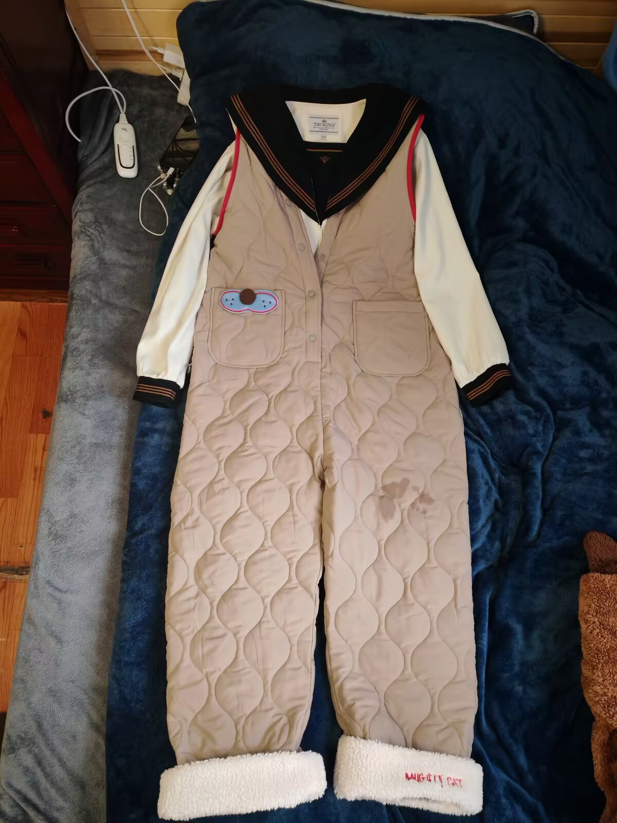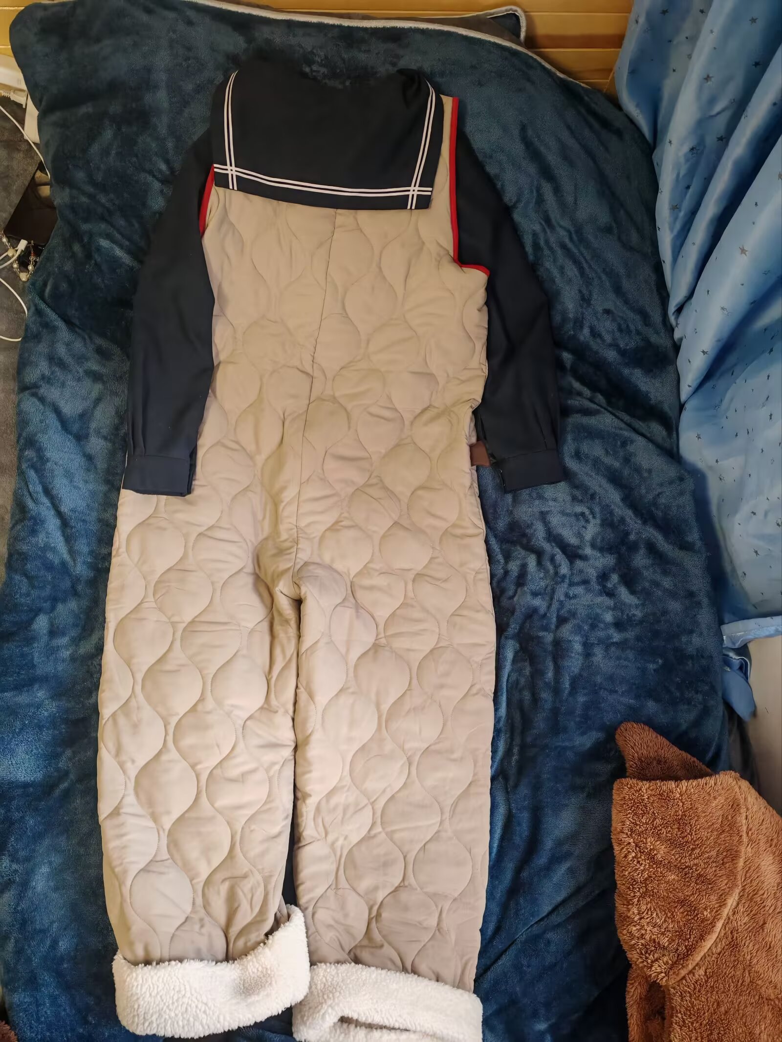 yso家买了一件连体衣,说是说睡衣,但外穿也可以,厚度有一点,穿起来挺暖和,上海今天-1~5℃,早上遛狗都不觉得冷,甚至我下面只穿了一条过膝袜而已。然后试了一下乱搭,把jk水手服穿里面,草。月野house家的茶羽中,这种关西襟的,因为襟型低,连体衣的纽扣无法都扣住,而粉粉朱家的兔仔小班是襟型最高的札幌襟,可以纽扣全部扣住。无论连体衣配什么,都感觉好可爱啊,关键他很暖和,上海的天气是可以穿这个的,也不冷。