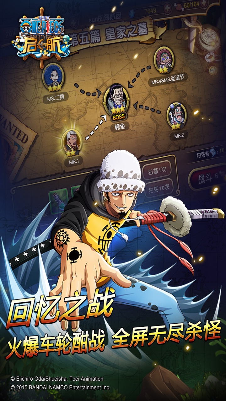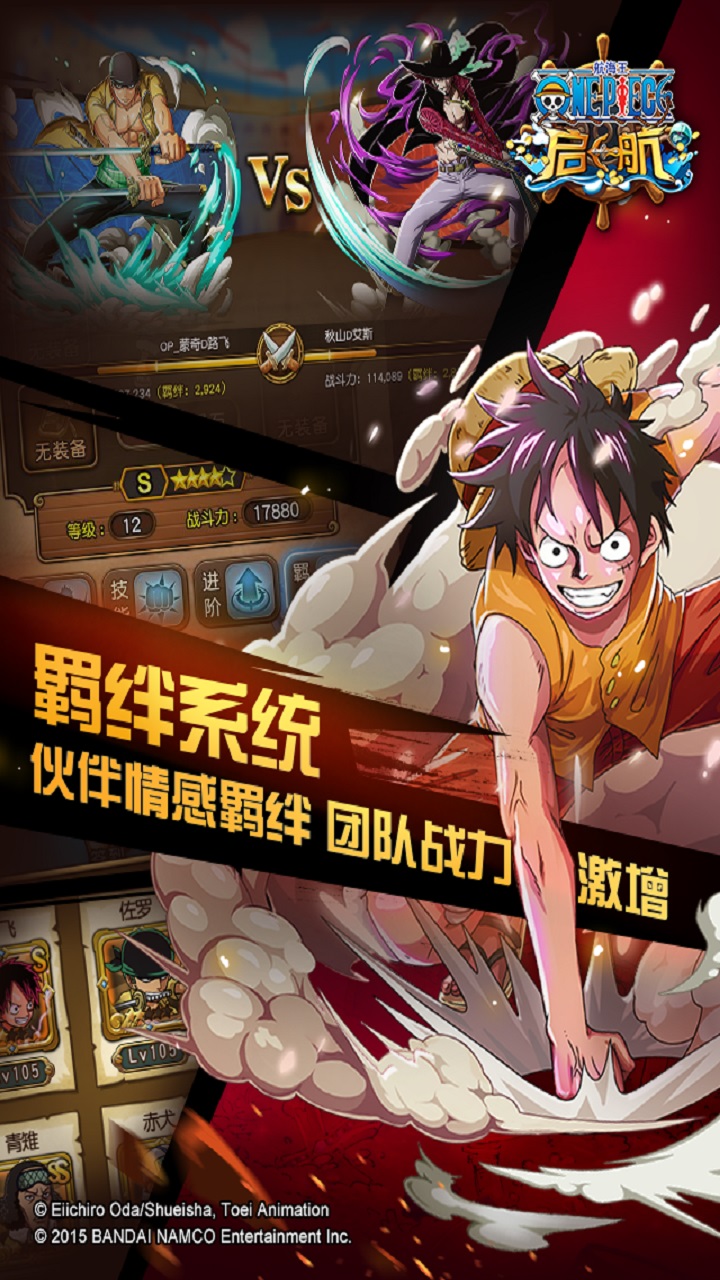 【游戏介绍】 《航海王 启航》作为首款获得ONE PIECE动画官方授权的冒险RPG游戏,使用日本原版人设造型,超一流品质保证。超逼真还原原著,重现经典剧情。原班海贼声优倾情加盟! 【游戏特色】 独创名人社交系统 首创紧张刺激的动作即时操作类玩法,独创名人社交系统,开创动作卡牌时代新玩法。 开创特色游戏副本 珍宝巡航、海底监狱,特色副本强悍来袭,和单一模式说再见,百变角色阵容,新玩法演绎海贼王 组建专属海盗团 通过收集培养原著中魅力十足的的各个角色,组建只属于自己的个性海盗团新势力,驰骋大海,走向成为海贼王的荣耀之路! 超还原原著剧情 在游戏的进行过程中,玩家可以体验原著丰富多彩的故事情节,再现原著中耳熟能详的经典剧情,瞬间回到那个热血沸腾的冒险世界!