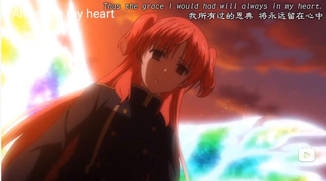 随便谈谈感受:这首插入曲出现时,记忆被星神侵蚀殆尽无法战斗的珂朵莉,为了救自己的爱人威廉,最后舍弃了自己全部的记忆和所剩无几的生命,从飞艇落下,彻底解放了黄金妖精的力量,在威廉即将坠落地面的时候接住了他和奈芙莲,并在之后拿起了圣剑,和地面上的第六兽死斗!在彻底释放力量战到力竭后,她留着幸福的眼泪对威廉说谢谢你!