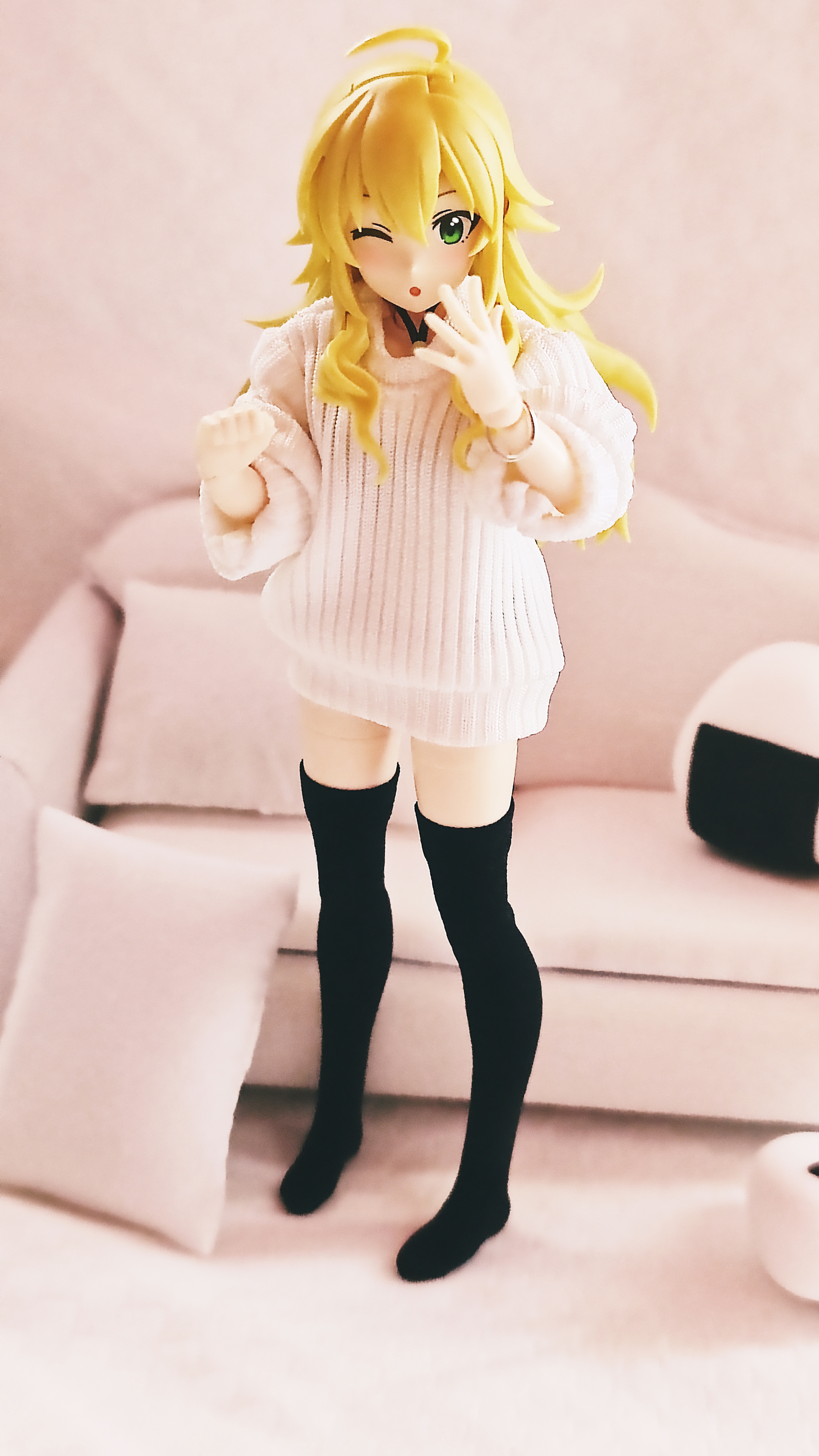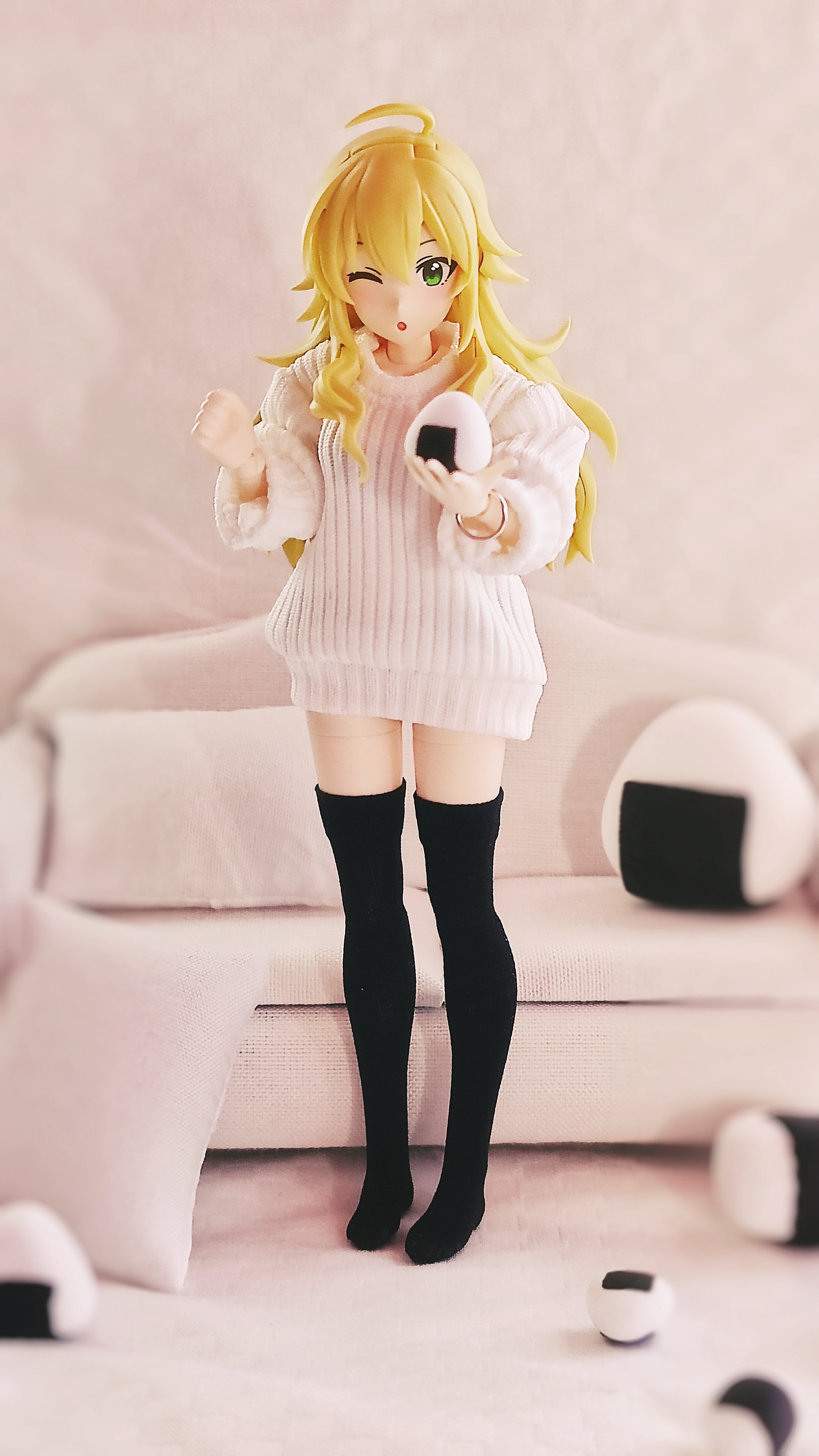 布置好场景,就开始让美希摆出各种pose。我让她微微侧身,左手轻轻抬起,像是正在摆弄手腕上那个新的“小手镯”似的,那正wink的微微脸红的俏皮表情,让此刻就像她收到了中意的礼物正洋洋得意似的。我又让她捧起一个小一些的饭团,虽然那个饭团还是显得稍大了些,但感觉这种略微大一些的大小,反而衬托出了一种夸张的萌感,好像她正开心地捧着一个超满足的点心,显得更加可爱了~