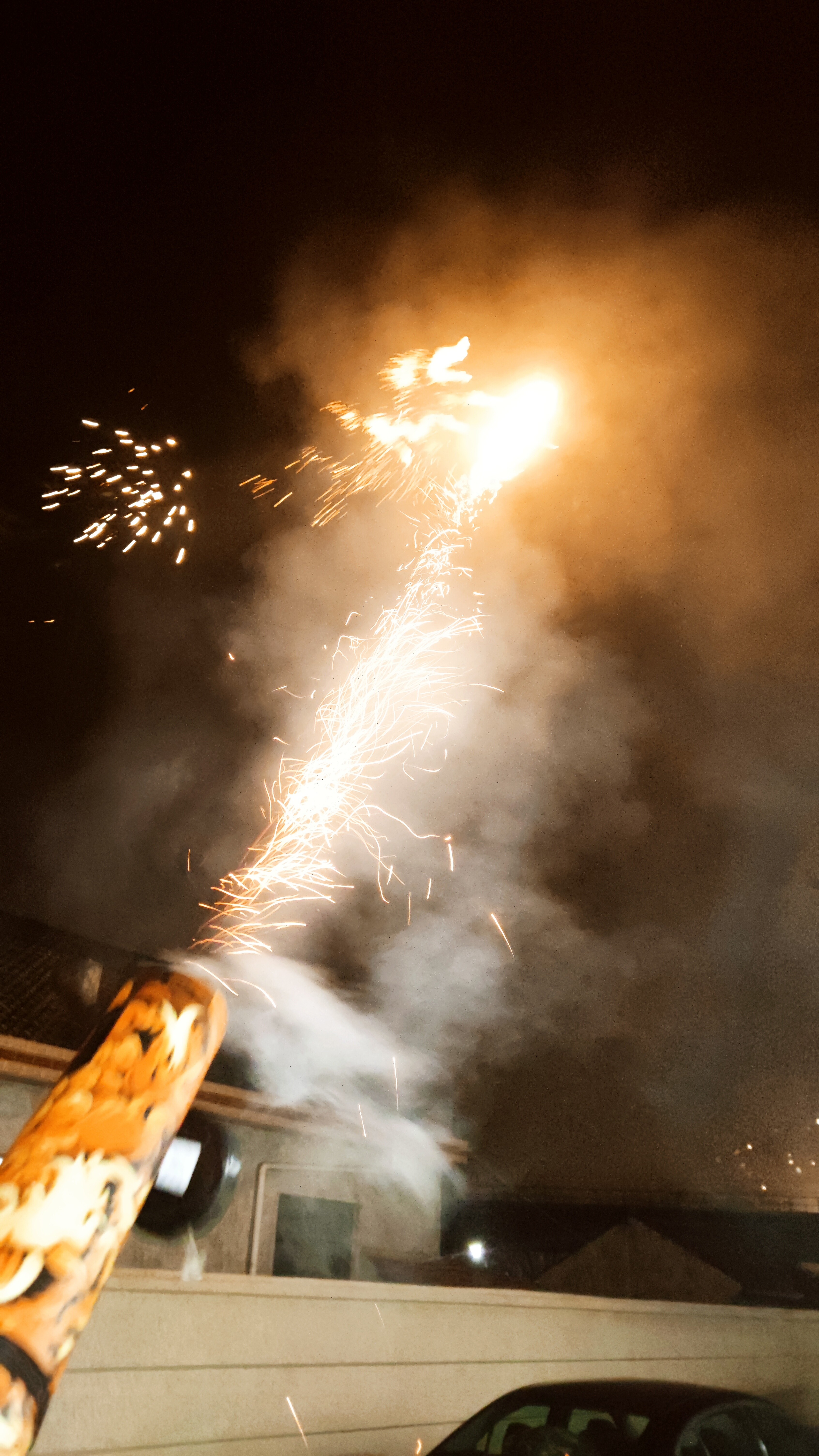 先是带着孩子们放了那个“加特林”,点燃引线之后咻咻咻的,射速还挺快,看着天空中爆出的一串烟花让我也感觉像是回到了童年一般开心,孩子们在旁边不断地扔着“手雷”,听着远处和身边的爆炸声,这气氛仿佛不是在过年而是在