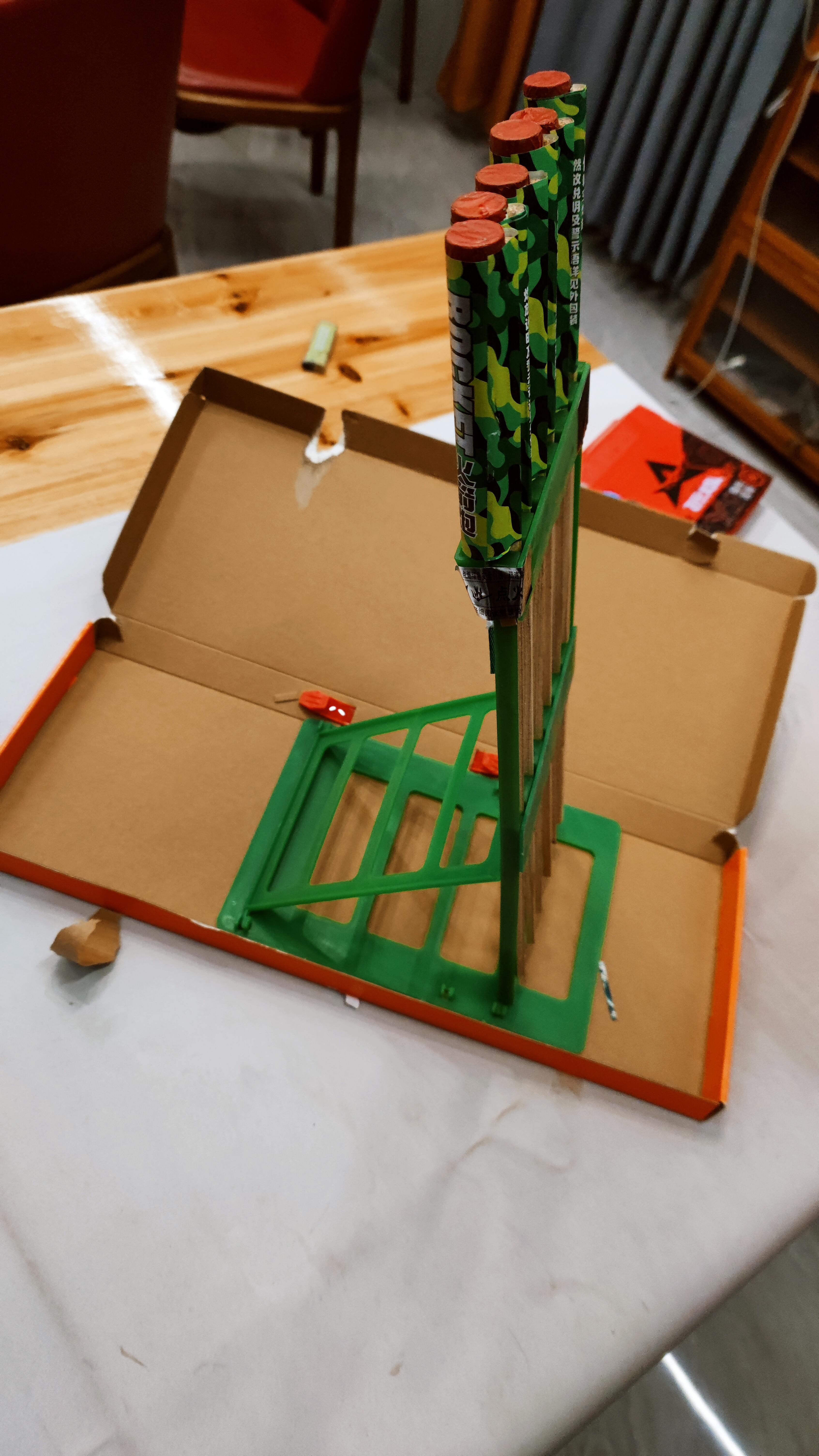 最后拿出了那个压轴项目——“喀秋莎”火箭炮,这发射架做的还真有模有样的,在空地上架好,让孩子们倒数发射时间,感觉还挺有仪式感……最后发射的那一瞬间,夜空被照得通明,火光和声响远超传统的“滋花”。孩子们在惊呼,大人们也觉得有些好奇。感觉像是观看一场微缩的“军事表演”……没想到除夕的烟花,还能用“火力覆盖”这个词来形容……