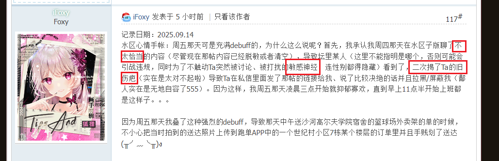 水区心情手帐:周五那天可是充满debuff的,为什么这么说呢?首先,我承认我周四那天在水区子版聊了不太恰当的内容(尽管现在那帖内容已经脱敏或者清空)。因为这样,我周五那天凌晨三点开始就抑郁寡欢,直到早上11点半开始上班都是这样子。。。