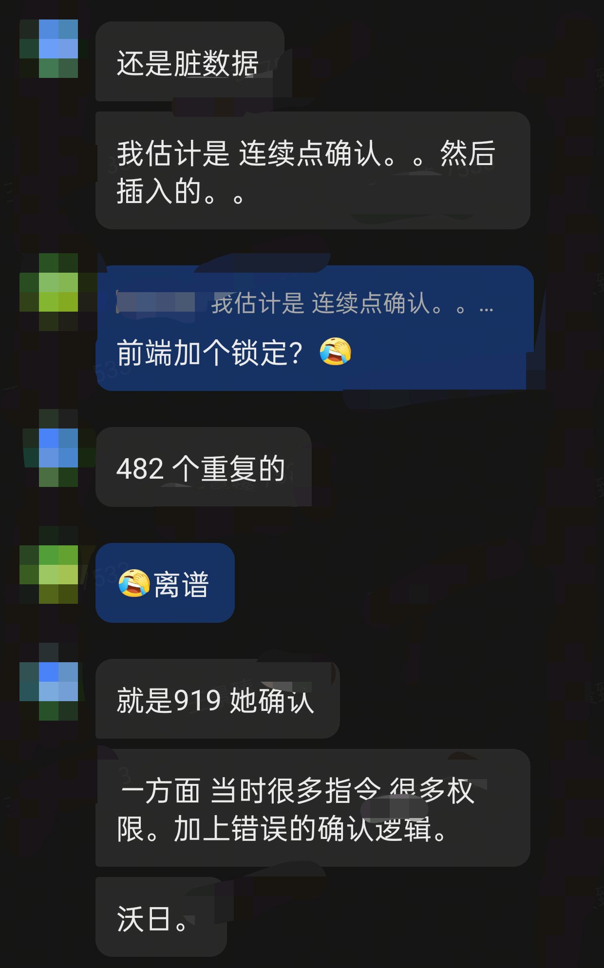 再加上前端没有锁界面的设置(就是点一个按钮,在请求得到响应结果前锁界面不给继续操作,我工作3年了第一次见过这种前端项目,甚至还是和钱有关的证券基金系统。。。。)