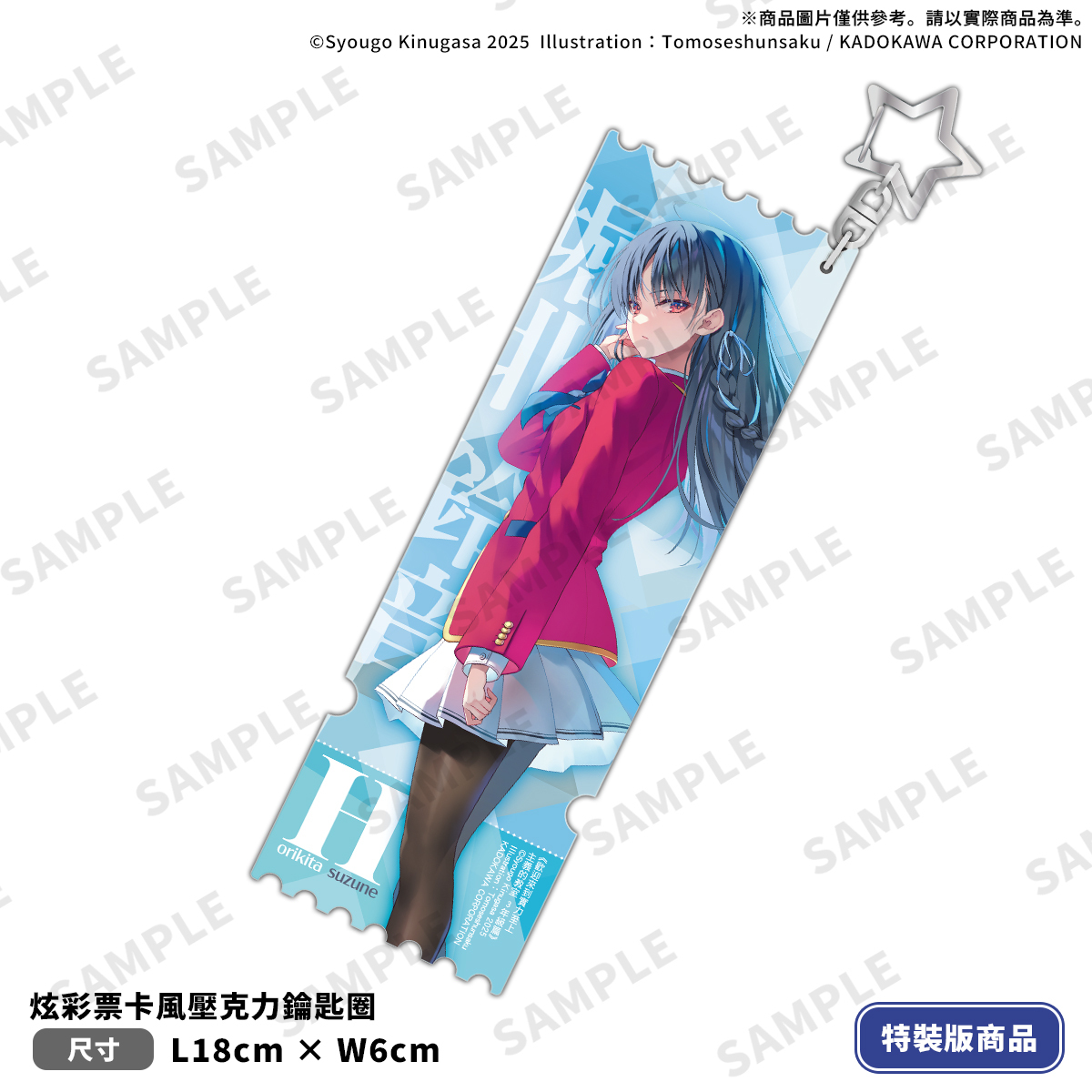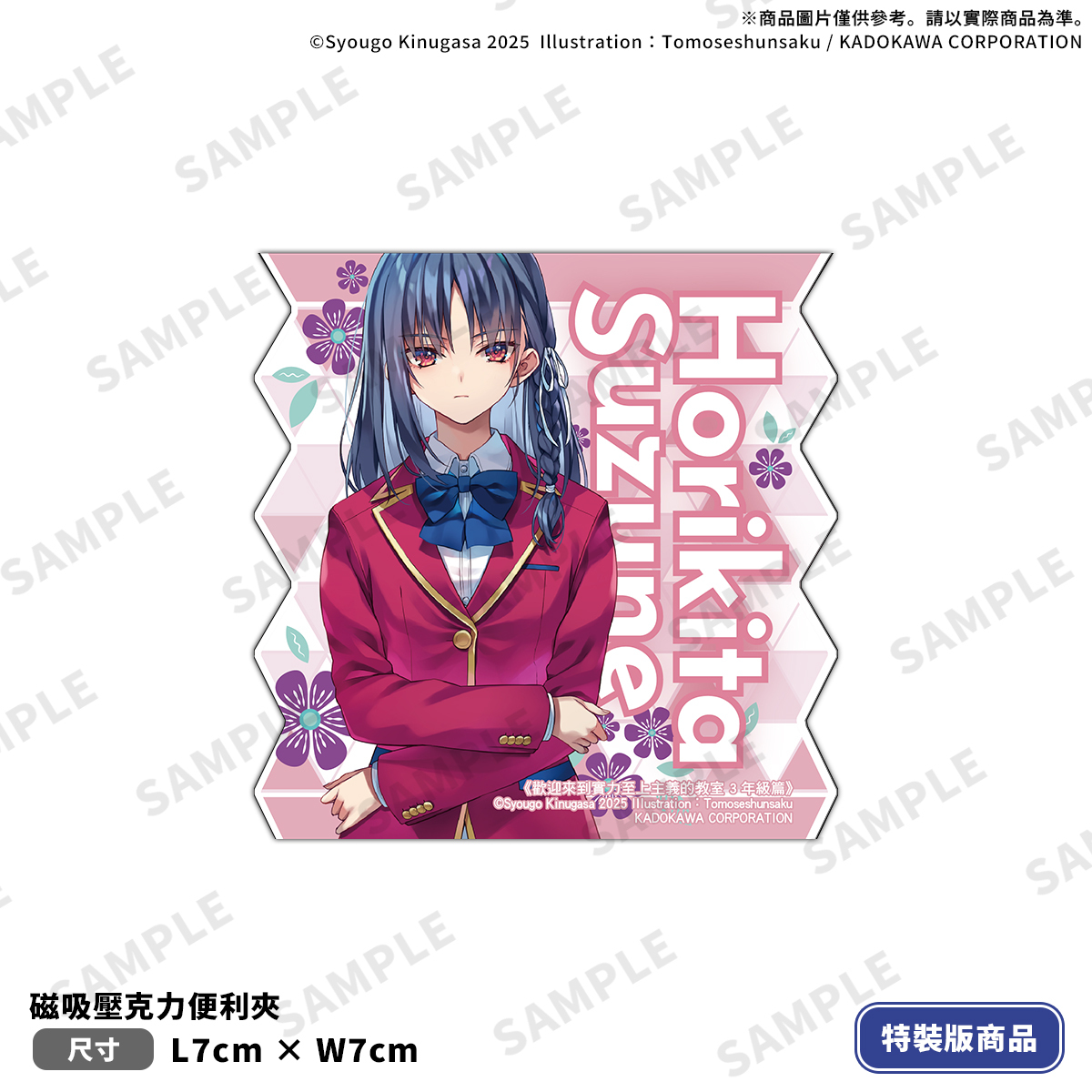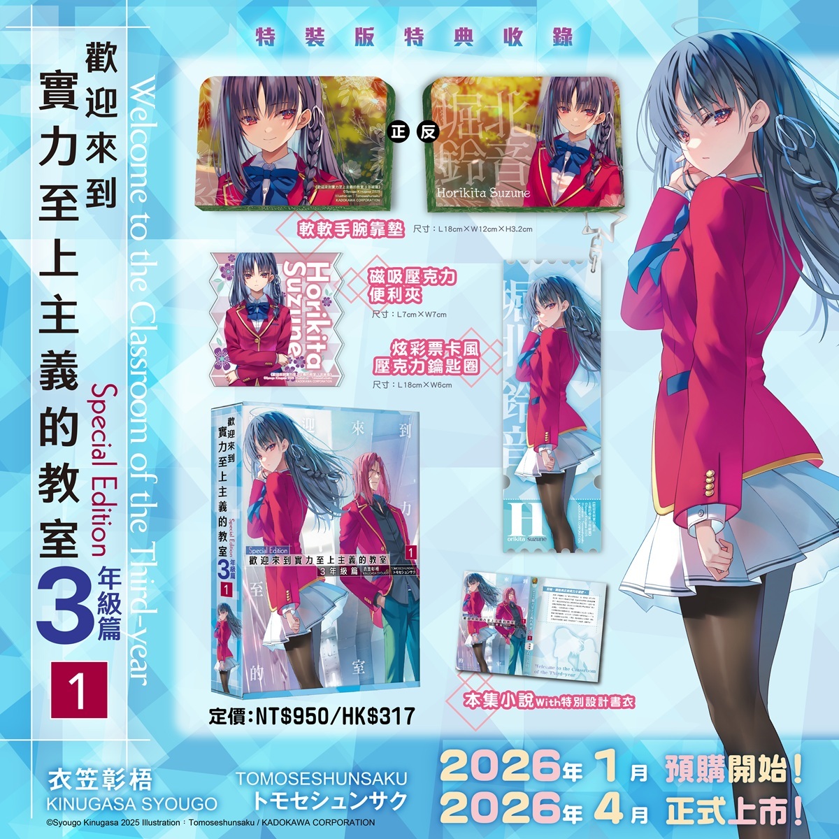 《欢迎来到实力至上主义的教室3年级篇(1)》特装版以女主角「堀北铃音」为设计主题,收录特典:「软软手腕靠垫」;「炫彩票卡风压克力钥匙圈」;「磁吸压克力便利夹」,并包含本集小说with 特别设计书衣。特装版可于全通路进行限期预购至2/6(五)。